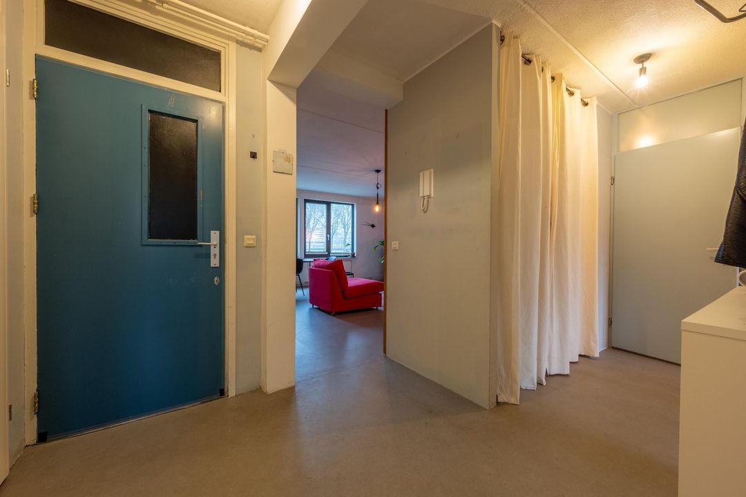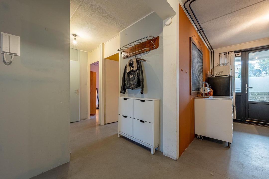 Je komt binnen via de algemene entree met toegang tot de bergingen en de andere woningen. Op de begane grond ligt de entree van dit appartement, waar je binnenkomt in een ruime hal met toegang tot het toilet, een kast met de cv-ketel en ruimte voor een garderobe.