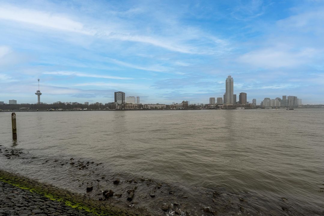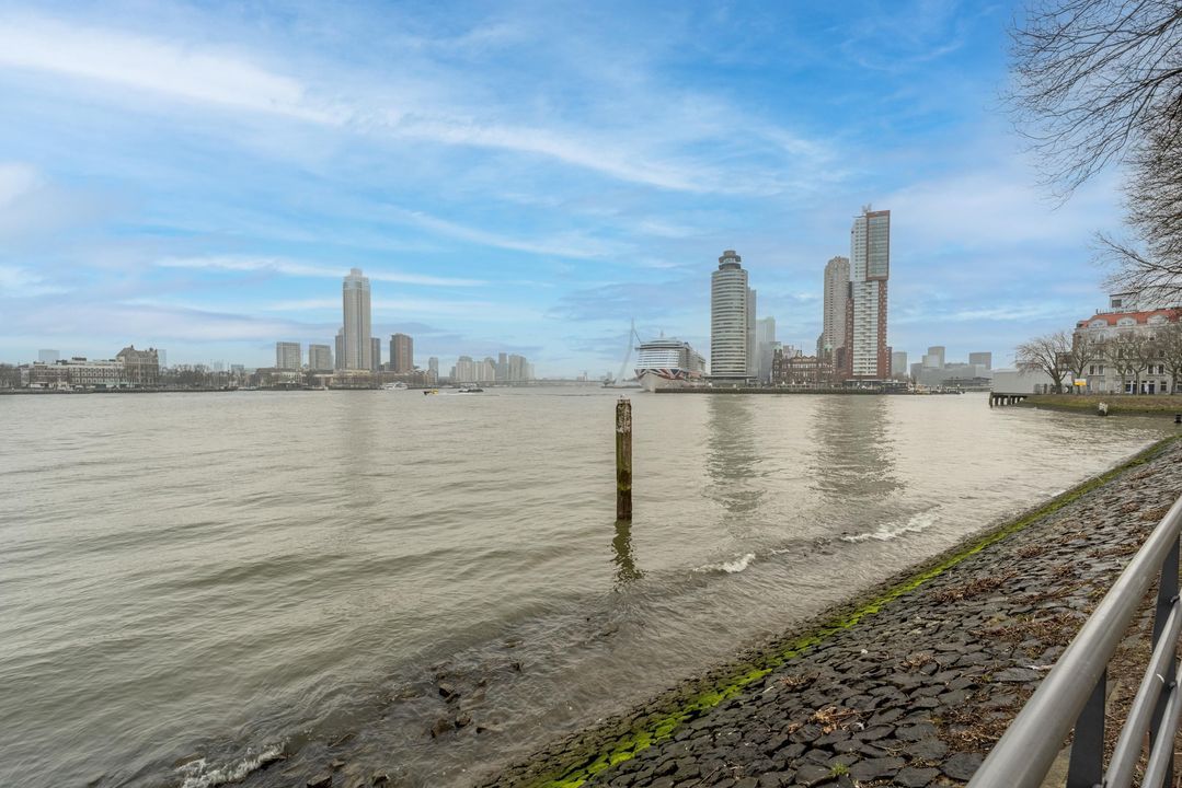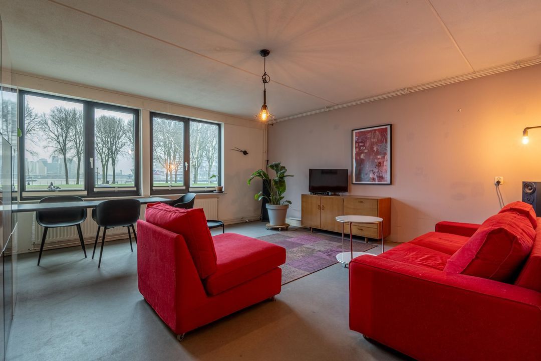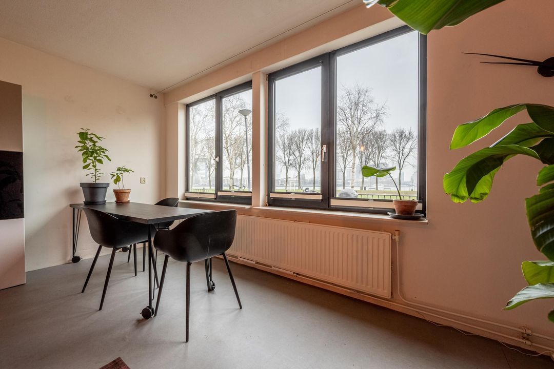 In de woonkamer word je direct getrokken naar het indrukwekkende uitzicht op de Erasmusbrug, de Kop van Zuid en de skyline van Rotterdam. Over de Maas varen grote vrachtschepen, cruiseschepen en pleziervaart voorbij, wat zorgt voor een levendig en dynamisch beeld.