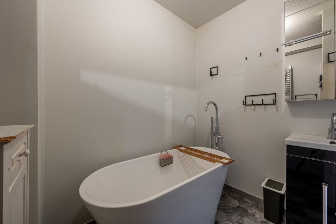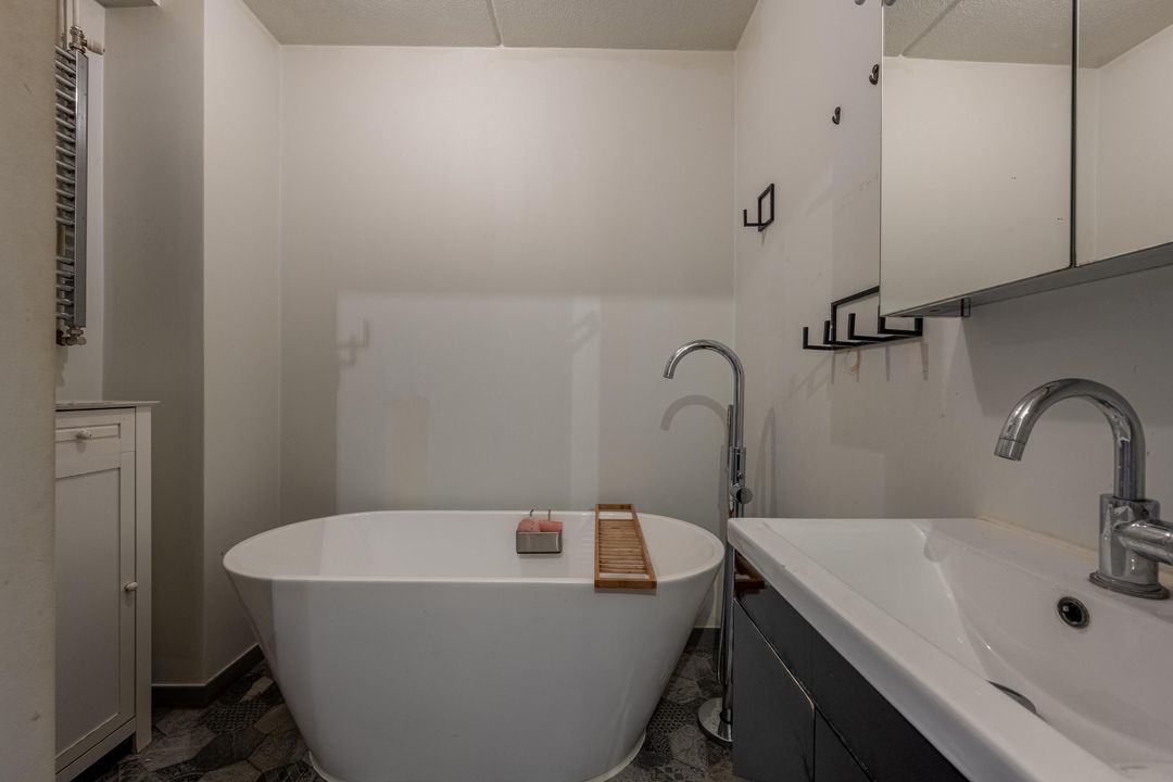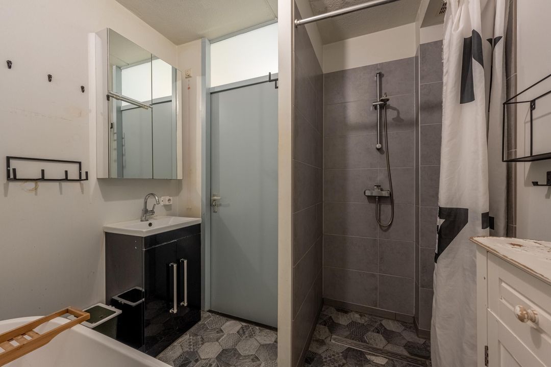 De badkamer is slim vergroot en stijlvol afgewerkt in moderne grijstinten. Je vindt hier een royale inloopdouche, een heerlijk ligbad en een strak wastafelmeubel, zodat je elke dag comfortabel en ontspannen begint en eindigt.
