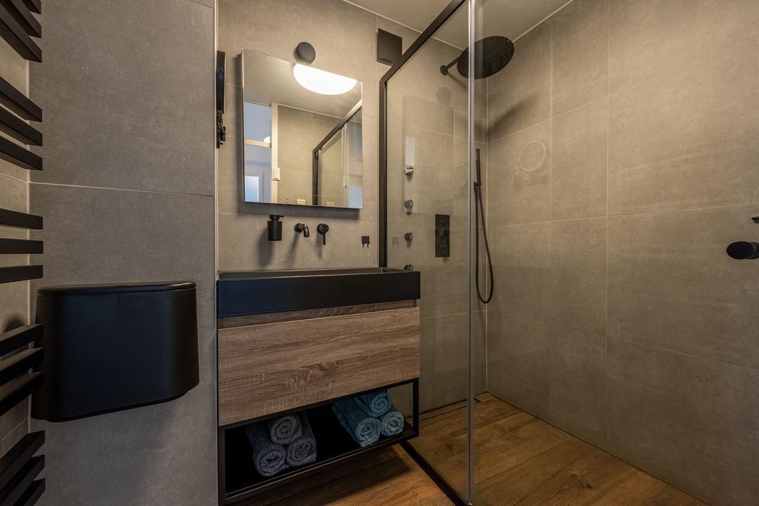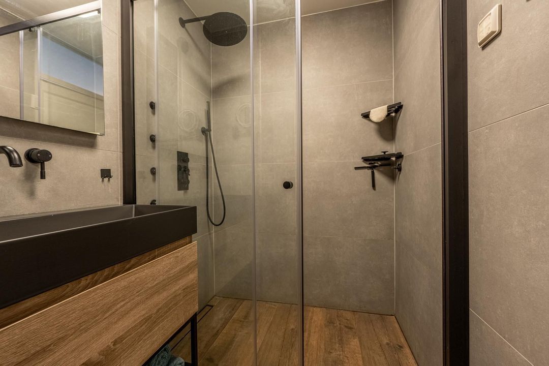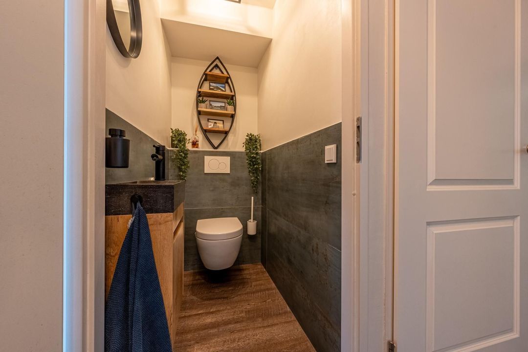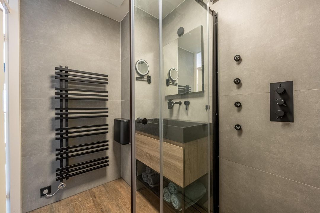 De moderne badkamer (2023) is stijlvol afgewerkt en voorzien van een inloopdouche met ingefreesde regendouche, handdouche en massage jets, een strak wastafelmeubel met spiegel en een design radiator voor warme handdoeken. Het toilet met fonteintje bevindt zich apart en is vanuit de hal te bereiken.