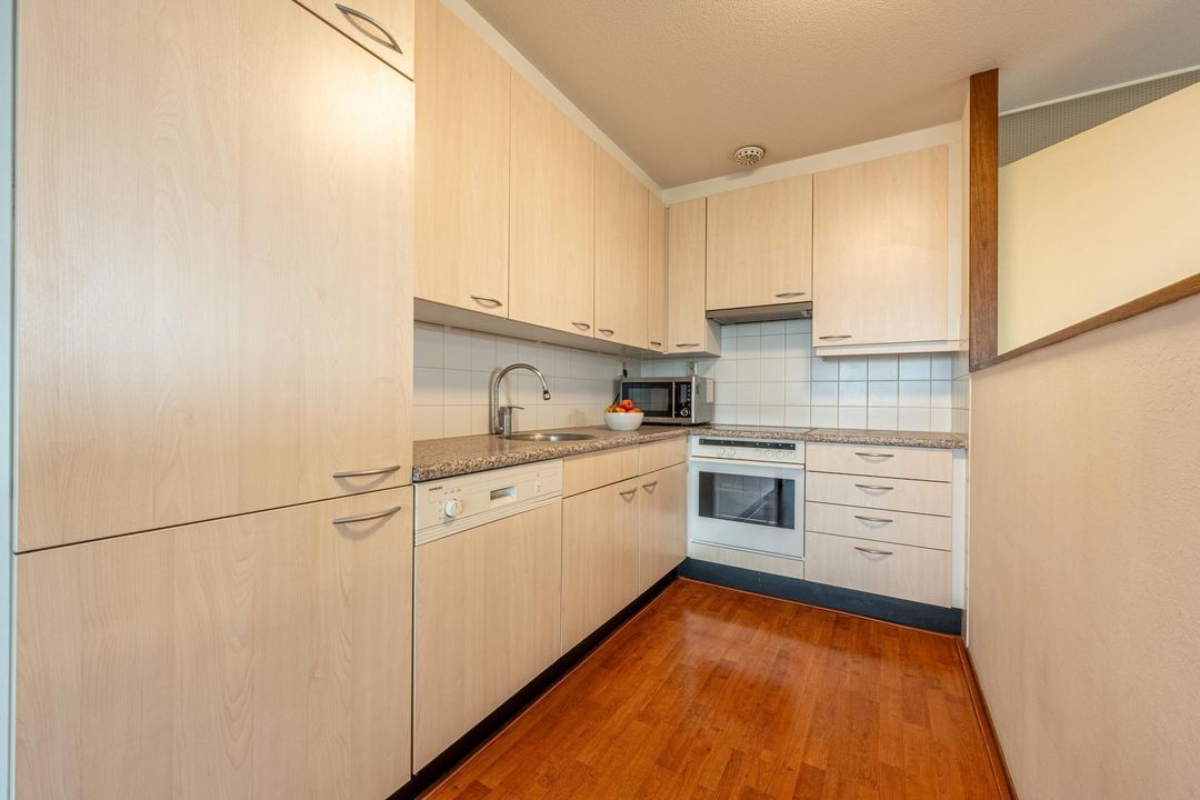 De keuken staat in open verbinding met de woonkamer. De keuken is onder andere ingericht met een kookplaat, afzuigkap, magnetron, koel-vriescombinatie en vaatwasser. De keuken is heeft een hoekopstelling en uitgevoerd met lichte fronten, een donker werkblad en bovenkasten voor extra bergruimte.