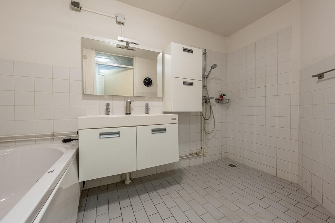 De badkamer is ingericht met een ligbad, inloopdouche en een wastafel met meubel. Daarnaast is er een separate toiletruimte aanwezig met een toilet en fonteintje.