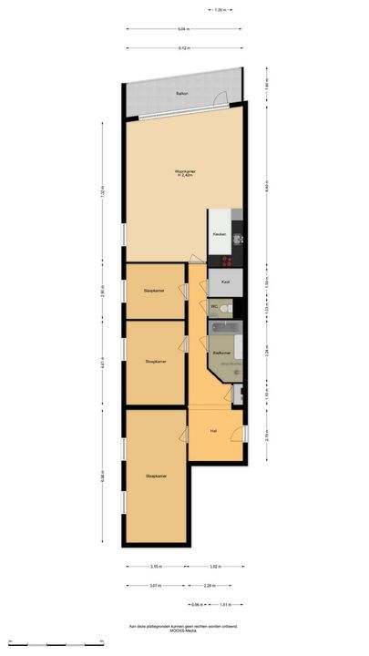 Entree, hal met toegang tot de woonkamer, drie slaapkamers, badkamer en toilet.