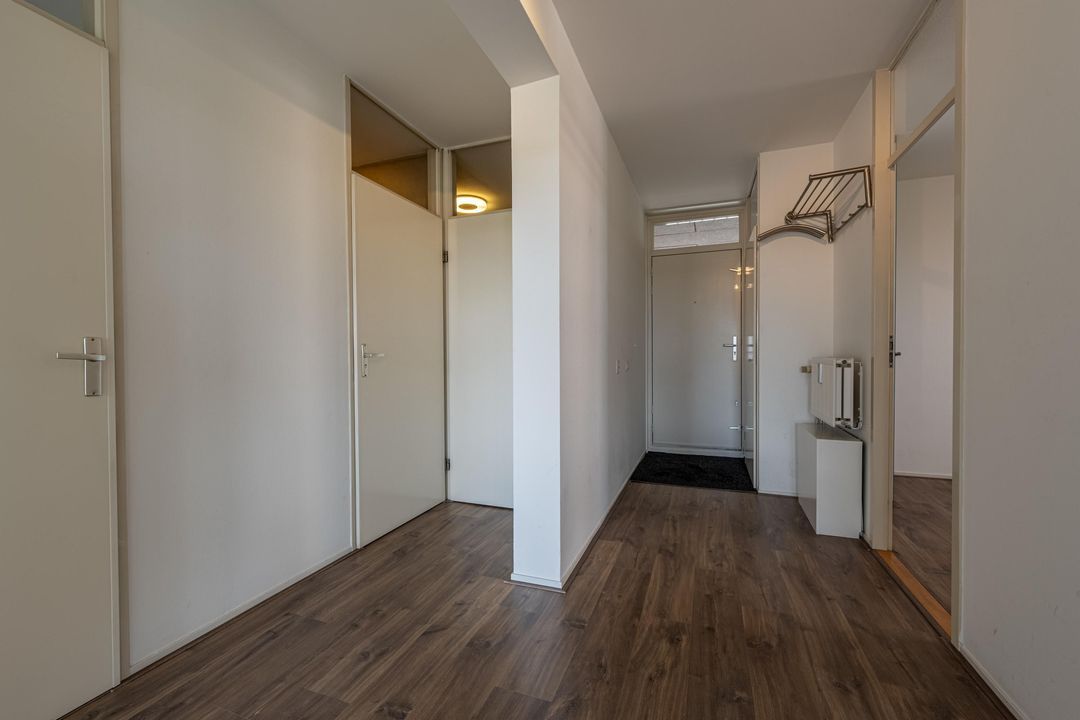 Door het hele appartement ligt een donkerbruine laminaatvloer, wat zorgt voor een rustige en uniforme uitstraling. De woning is voorzien van een video-deurbel waarmee je vanuit de woonkamer gasten toegang kunt geven tot de centrale entree. Alle ramen zijn uitgevoerd als draaikiepramen.