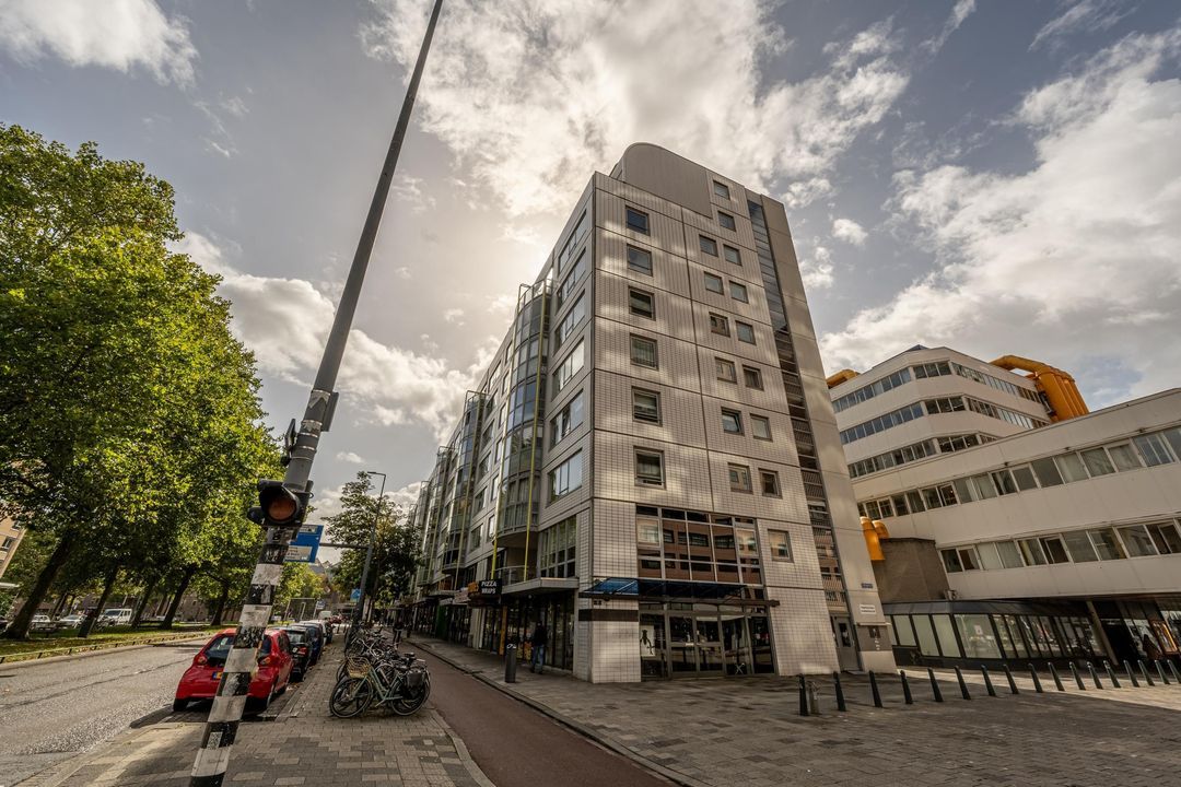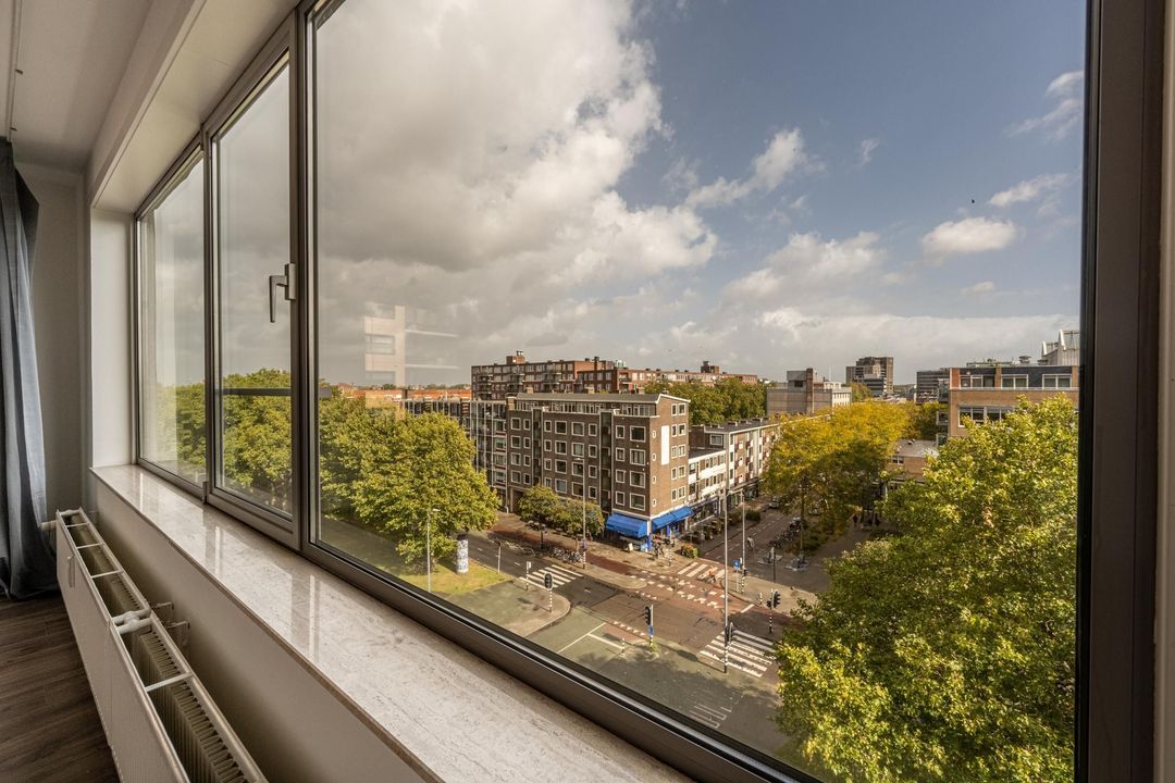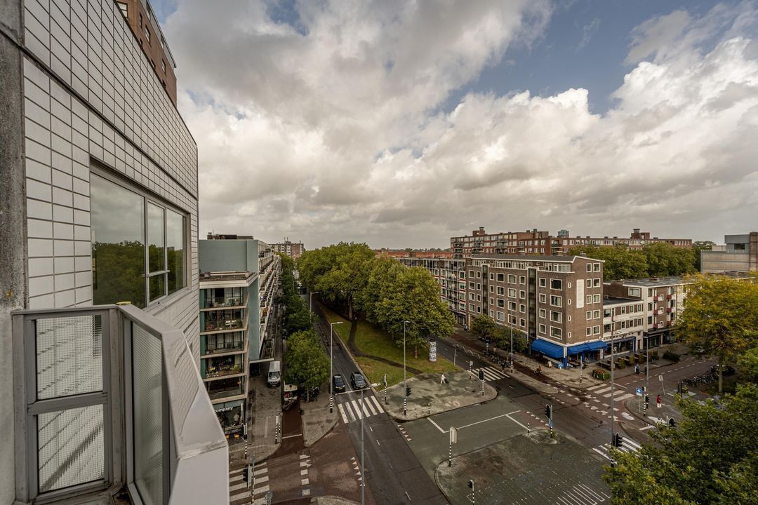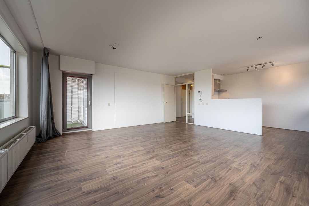 De woonkamer is opvallend licht door de raampartijen aan meerdere kanten. Je kijkt uit over de Hoogstraat en Mariniersweg, terwijl de ligging op de zevende verdieping zorgt voor rust en privacy. Vanuit de woonkamer heb je toegang tot het balkon – een fijne plek om buiten te zitten.