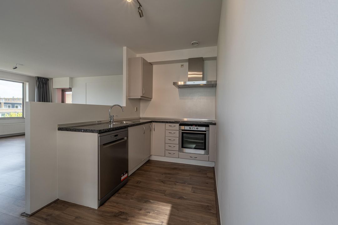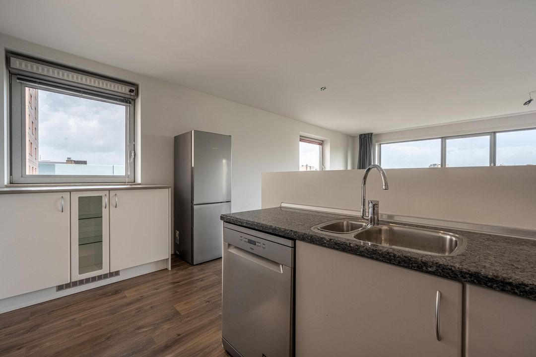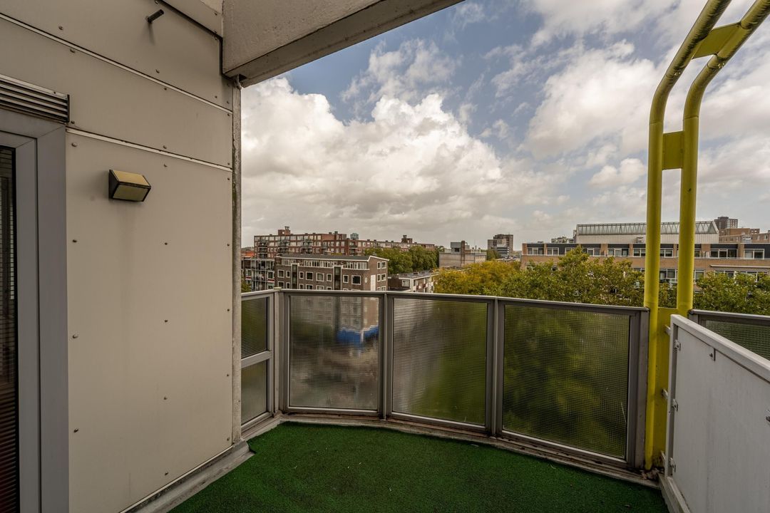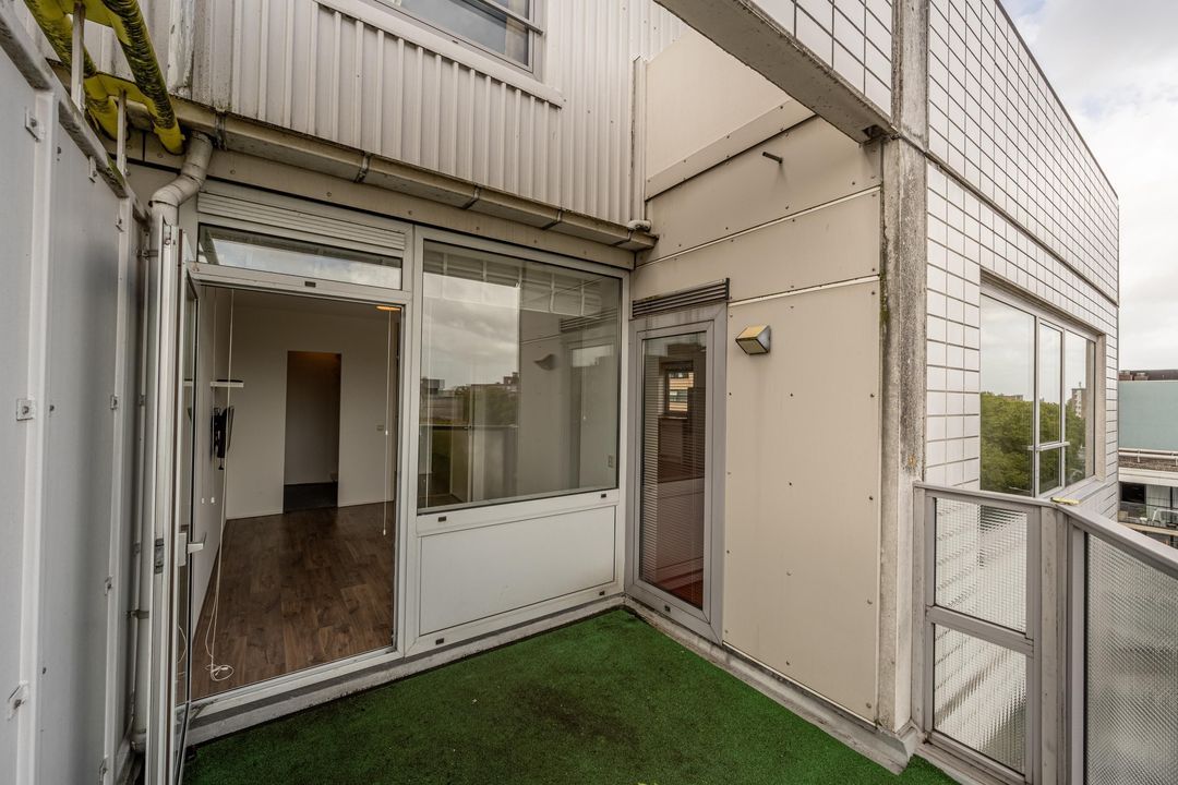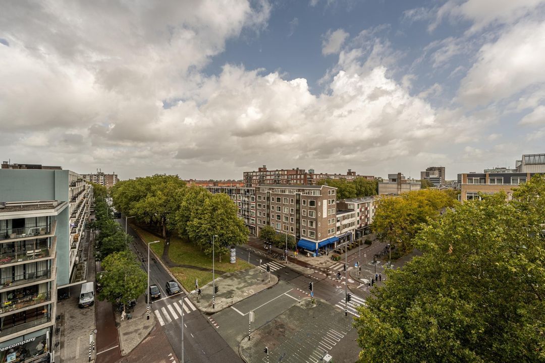 De woonkamer is opvallend licht door de raampartijen aan meerdere kanten. Je kijkt uit over de Hoogstraat en Mariniersweg, terwijl de ligging op de zevende verdieping zorgt voor rust en privacy. Vanuit de woonkamer heb je toegang tot het balkon – een fijne plek om buiten te zitten.