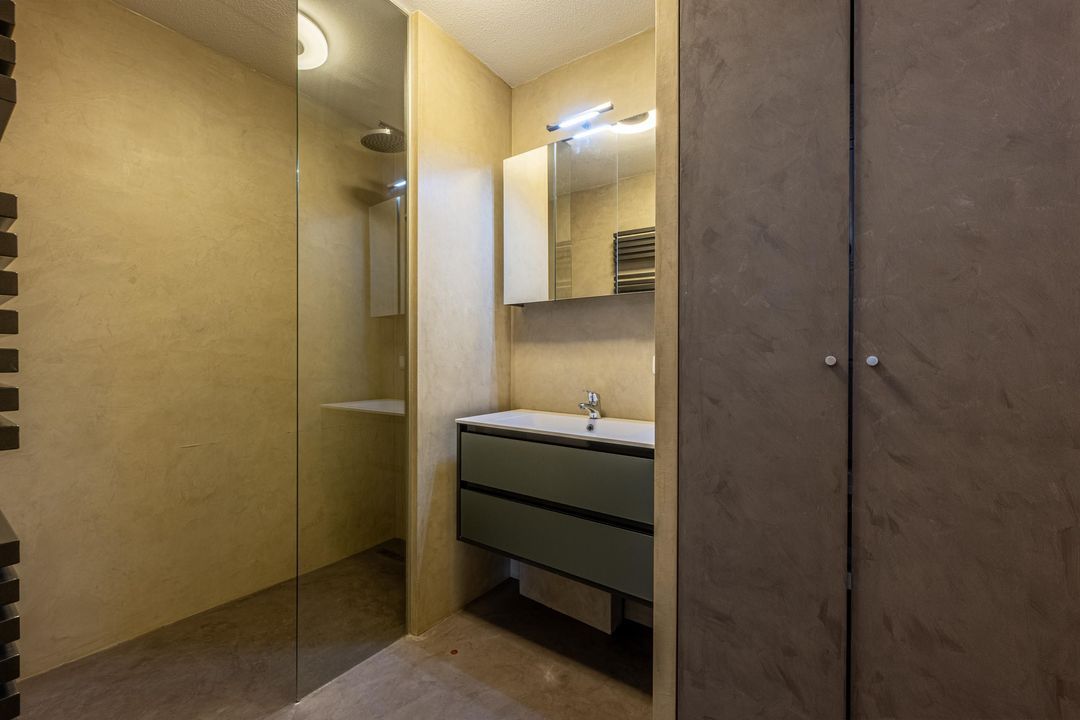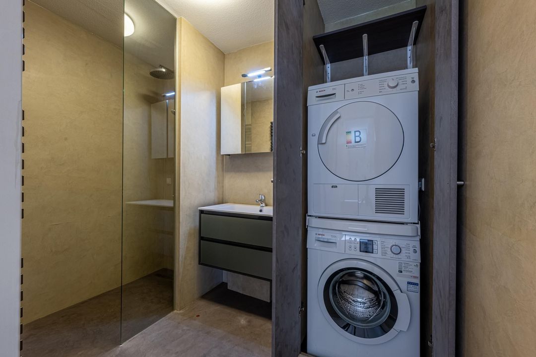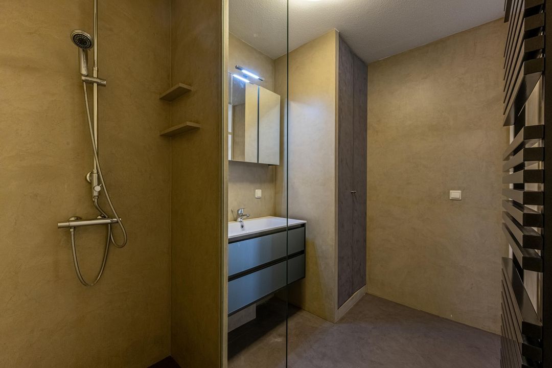 Modern afgewerkt in betonlook met een epoxy vloer en wanden in dezelfde stijl. De badkamer beschikt over een ruime inloopdouche, een wastafelmeubel met bergruimte, een designradiator en aansluitingen voor wasmachine en droger.