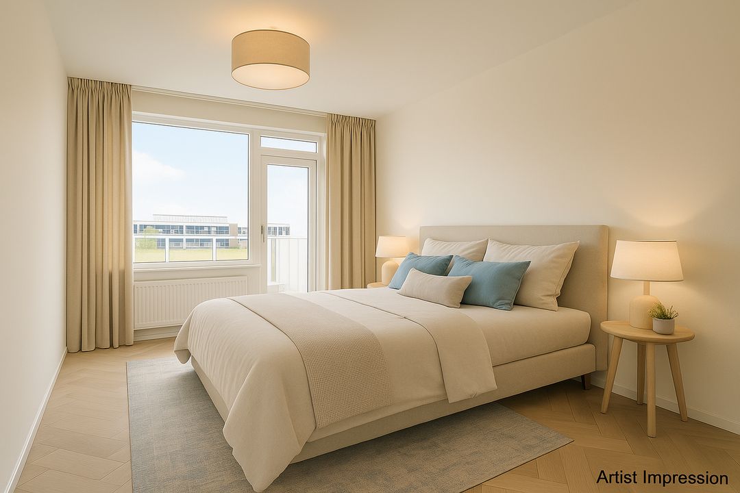 Aan de zijkant van het appartement ligt de eerste slaapkamer. Dankzij aluminium kozijnen met dubbel glas en ventilatieroosters is het hier stil en comfortabel. De ligging op hoogte zorgt bovendien voor minimale geluidsoverlast van de straat.