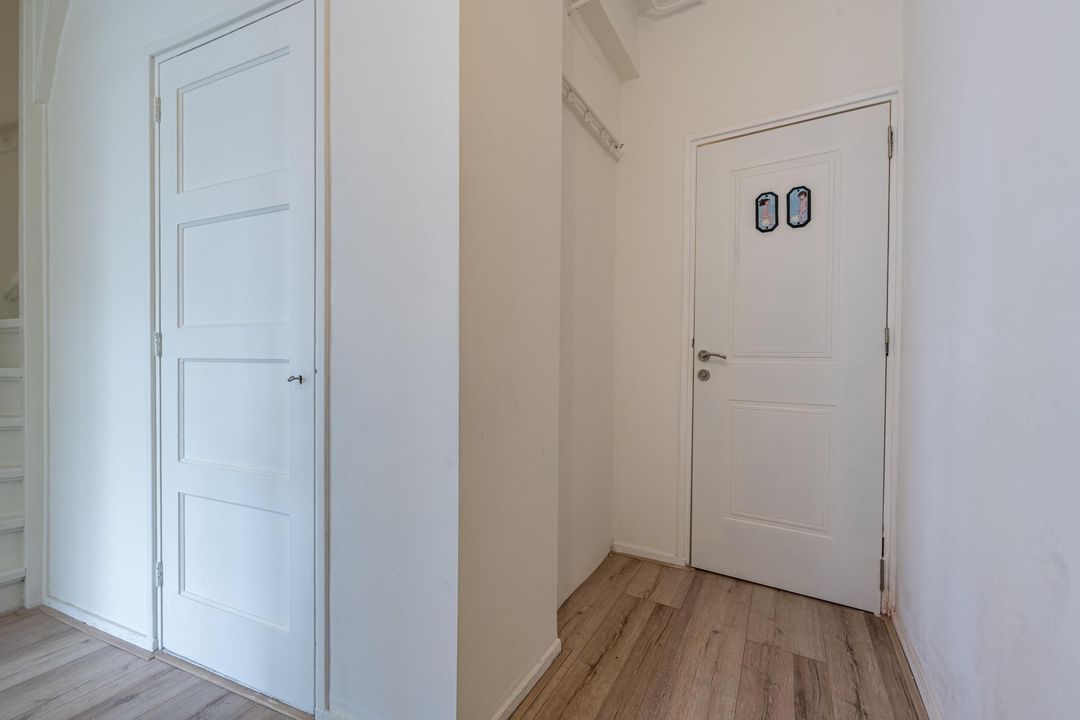 Naast het toilet is er een ruime opbergkast met plek voor jassen en schoenen, ideaal om alles netjes op te bergen. Vanuit de hal kijk je richting de fraaie ronde trap, een speels en elegant element dat meteen karakter geeft aan de woning.