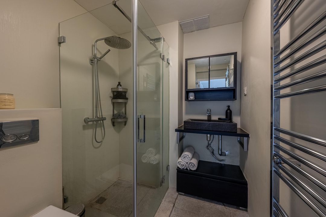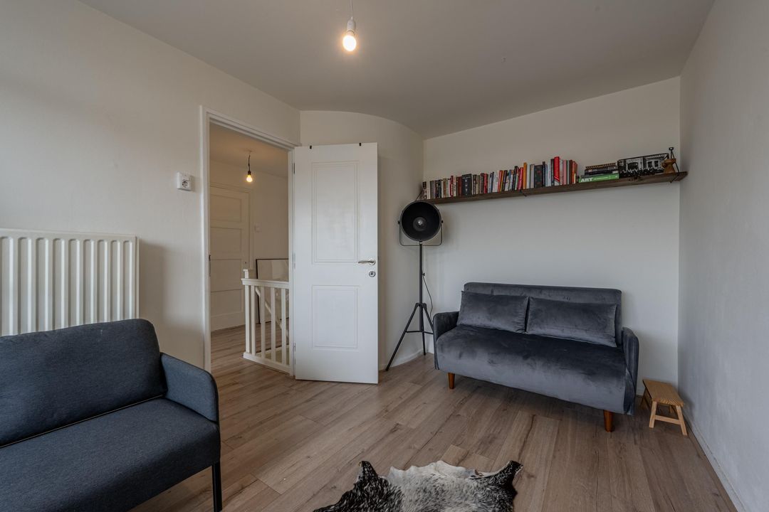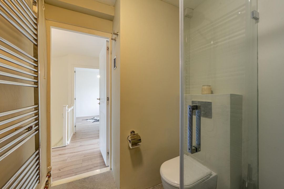 De badkamer op deze verdieping is modern en volledig vernieuwd. Alles is strak geverfd en gestuct, en voorzien van ventilatie. De ruimte beschikt over een douchecabine, een extra hangtoilet, een wastafel en een designradiator. De combinatie van eigentijdse tegels en frisse kleuren geeft de badkamer een serene, verzorgde uitstraling.