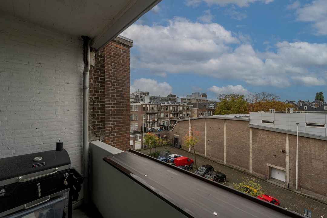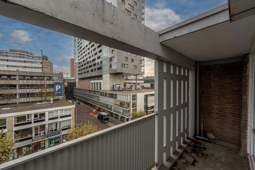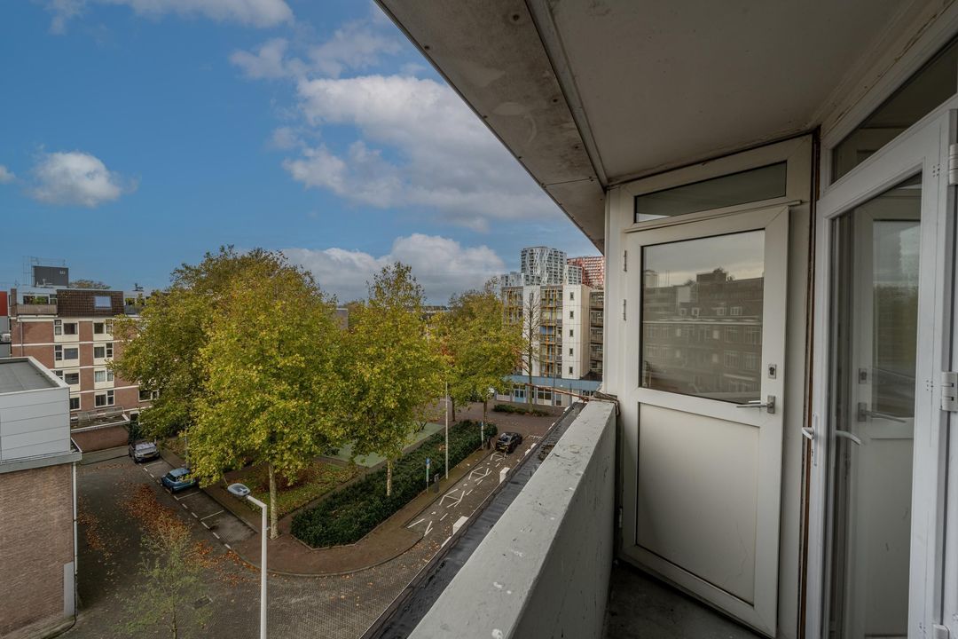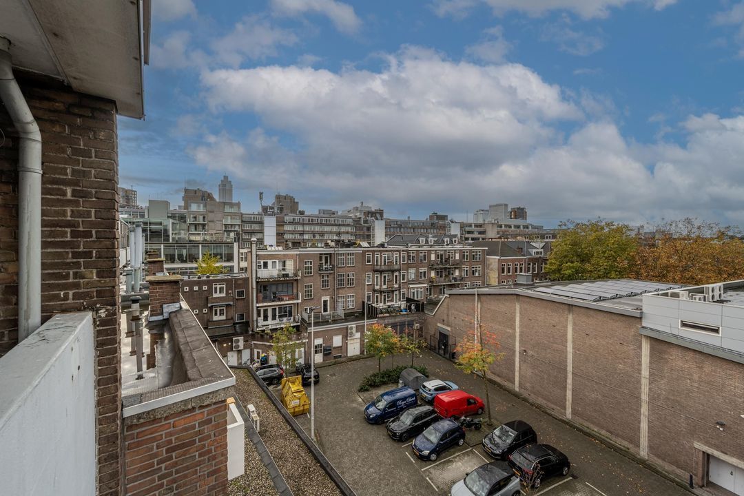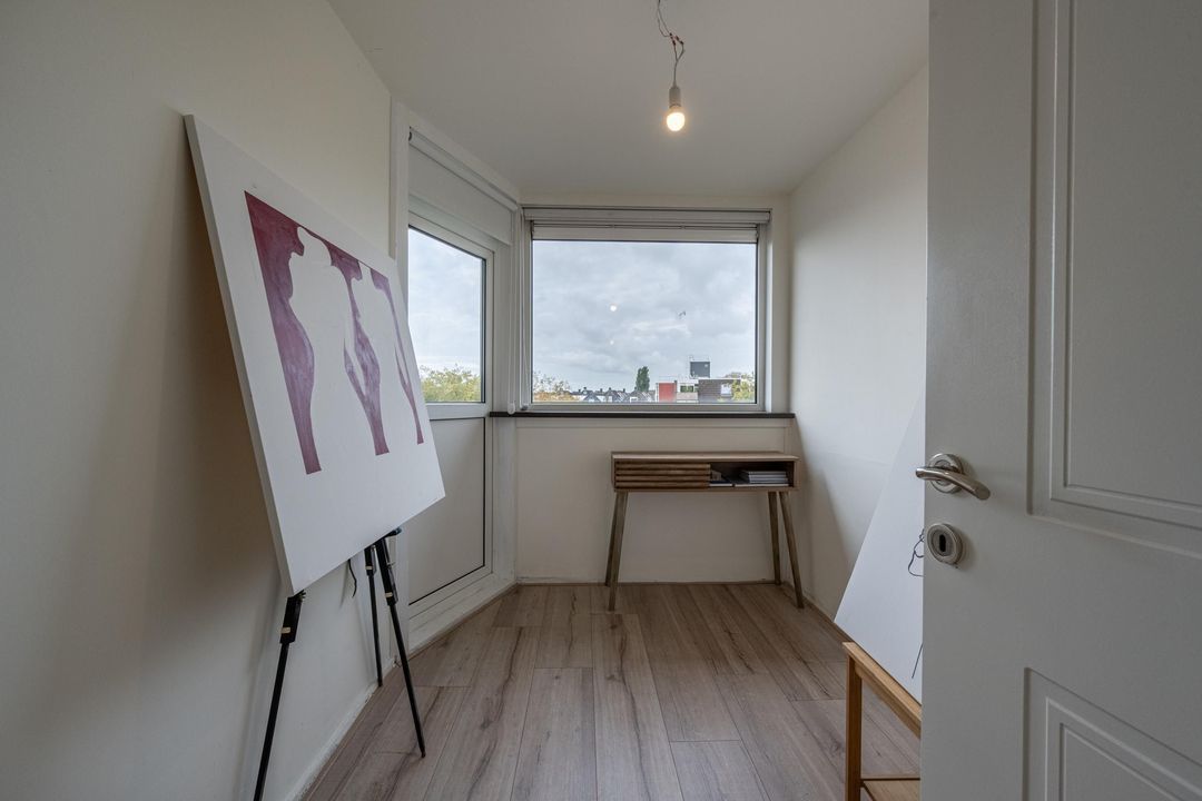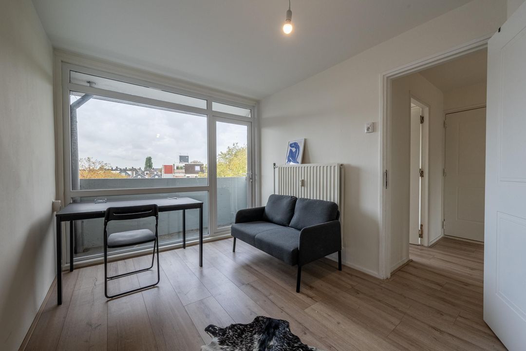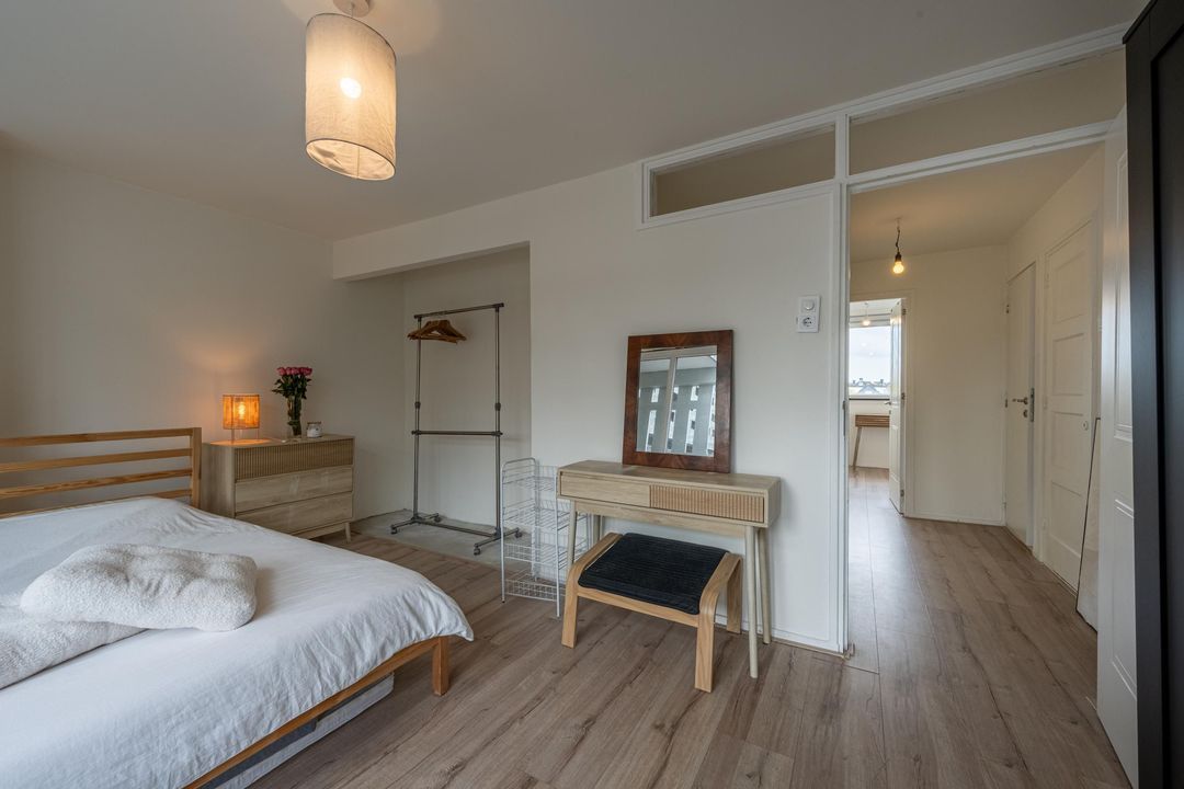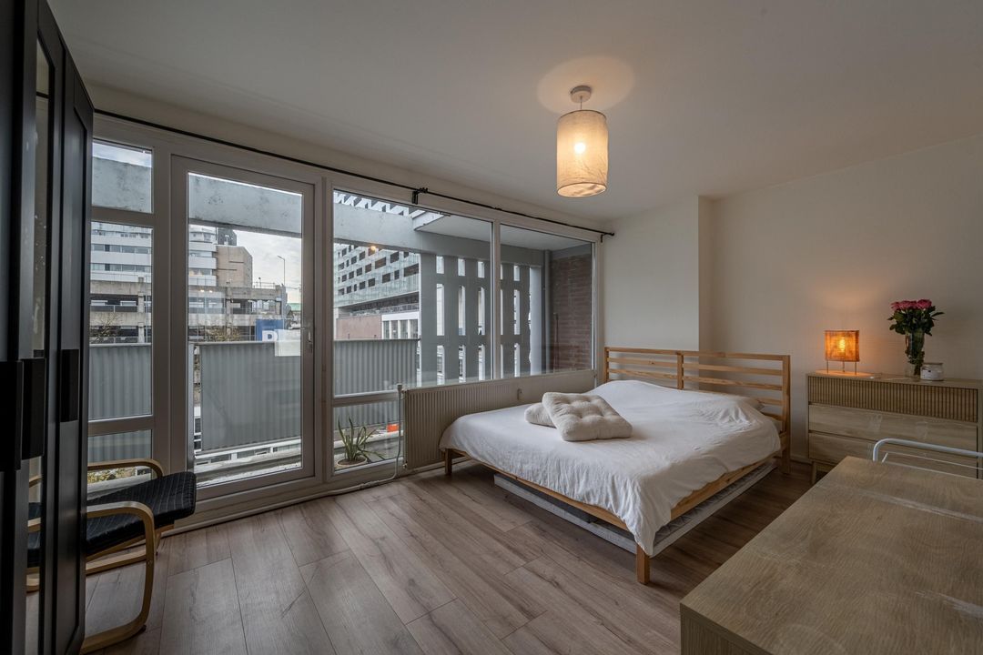 De hoofdslaapkamer ligt aan de voorzijde en heeft een prachtig balkon met uitzicht over de levendige Kareldoormanstraat. Dit balkon is deels overdekt, zodat je er zowel in de ochtendzon als ’s avonds kunt zitten. De kamer heeft ramen van vloer tot plafond, wat zorgt voor een schitterende lichtinval. In de muur is een handige inkeping gecreëerd die ruimte biedt voor een inbouwkast.