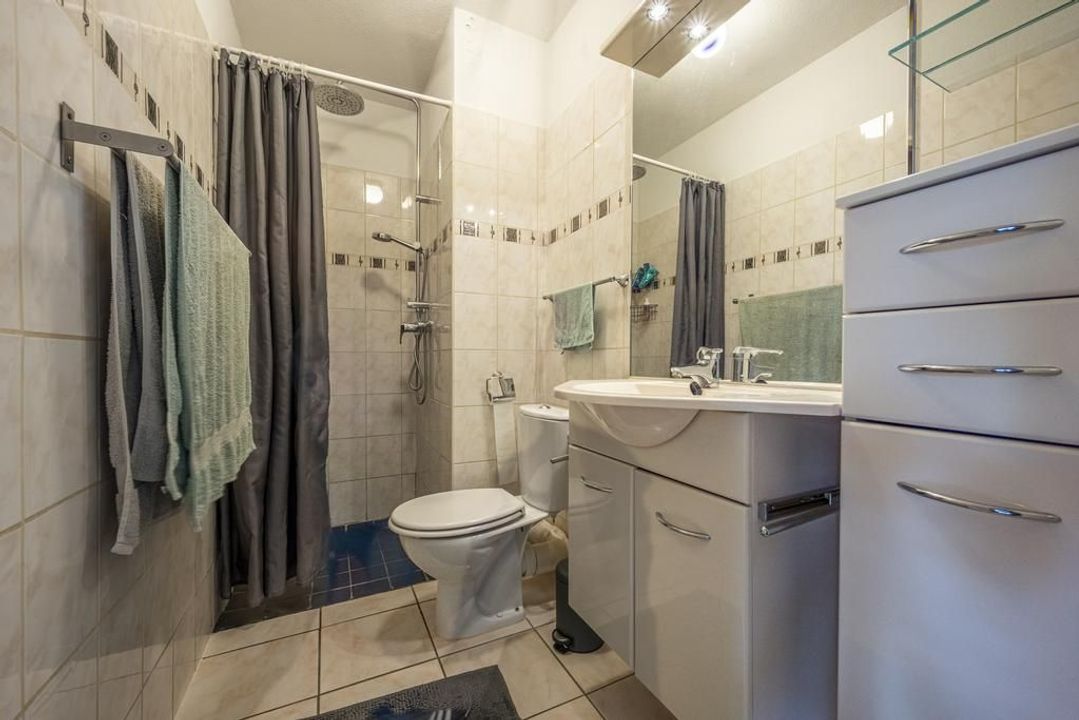 Aan de achterzijde bevindt zich de badkamer met inloopdouche en heerlijke regendouchekop, wastafelmeubel, praktische handdoekenkast en een toilet.