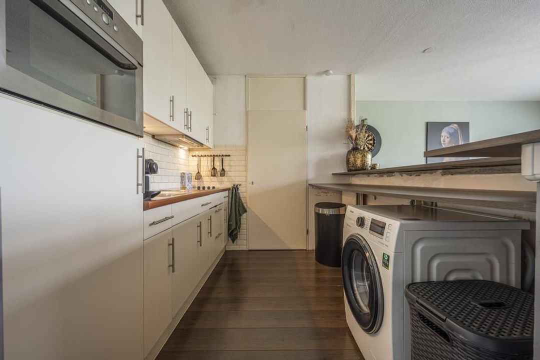 Entree met directe toegang tot de woonkamer met open keuken. Er is ruimte voor een gezellige zithoek en voor een hapje en drankje neem je plaats aan de bar. De open keuken is voorzien van een ceramische kookplaat met 4 kookzones, afzuigkap, combi magnetron en een koel-vries combinatie. Onder de bar is de wasmachine aansluiting gesitueerd. Daarnaast is er een praktische vaste kast met veel opbergruimte voor voorraadartikelen en een extra koelkast of vriezer. De woonkamer is eveneens voorzien van een vaste kast met planken.