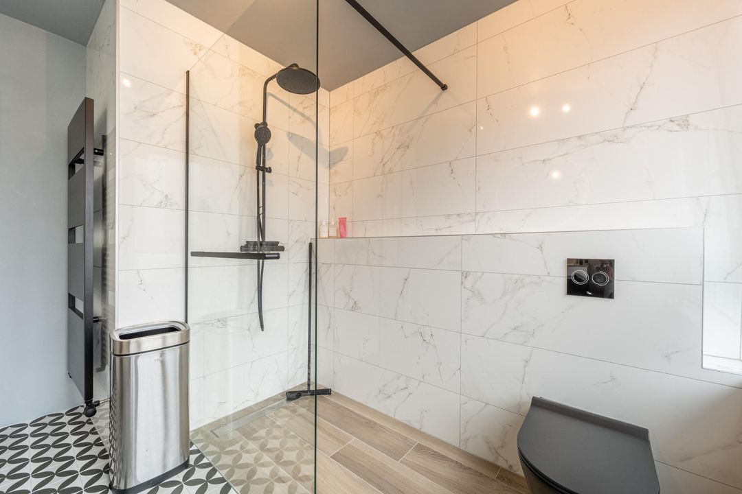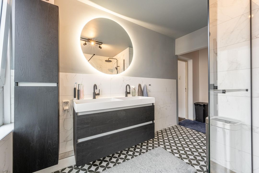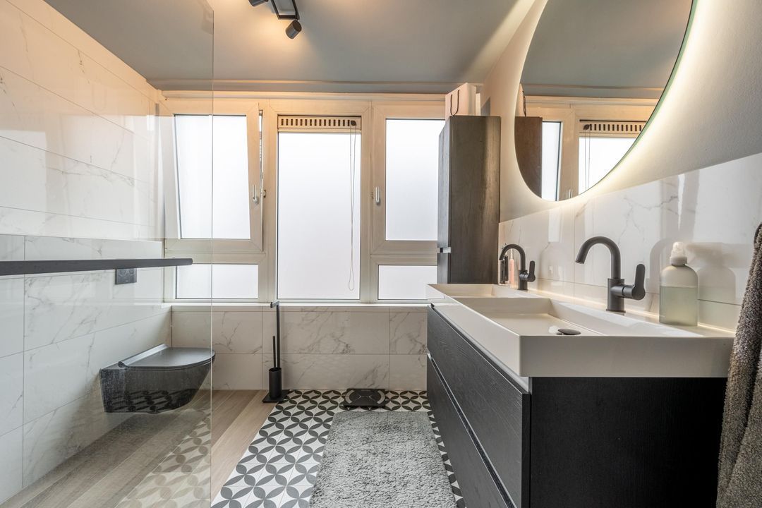 De moderne badkamer is in 2024 volledig vernieuwd en biedt een luxe inloopdouche, tweede toilet, dubbel wastafelmeubel, handdoekenkast en een designradiator. Verder is er een aparte wasruimte met opstelplaats voor een wasmachine en droger.