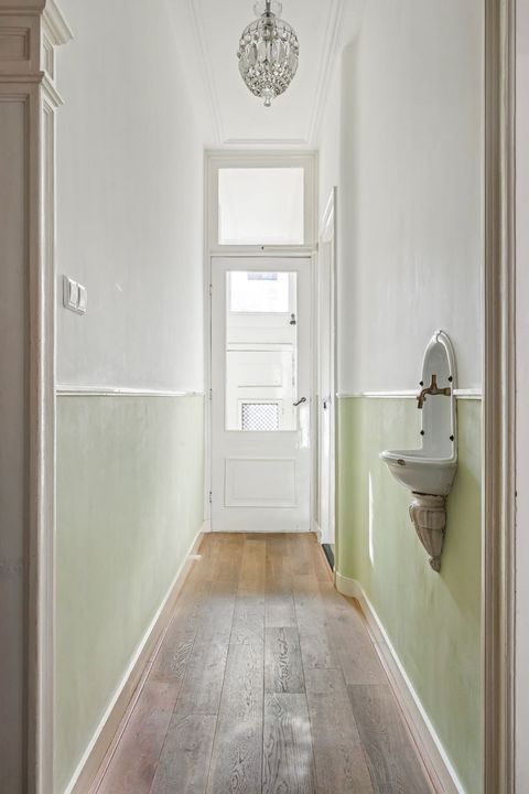 Via de stijlvolle hal met hoge plafonds, klassieke lambrisering en een charmant fonteintje word je direct verwelkomd in de sfeer van deze karaktervolle woning.