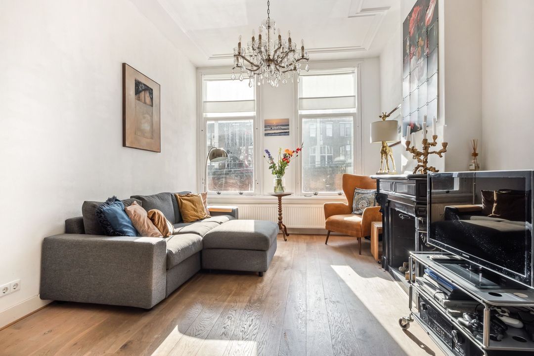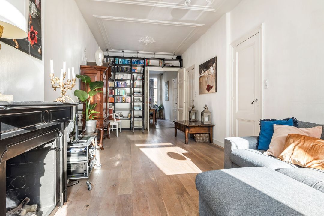 De woonkamer aan de voorzijde vormt het warme hart van het huis. Hier komen een eikenhouten vloer, grote ramen met voorzetglas, een gashaard en een op maat gemaakte boekenkast prachtig samen. De hoge sierplafonds met ornamenten geven de ruimte extra allure en onderstrepen het historische karakter.