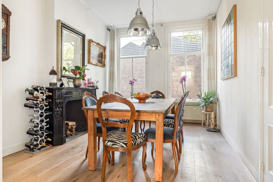 Aansluitend bevindt zich de eetkamer, bereikbaar via de kamer-en-suite deuren. Deze sfeervolle ruimte beschikt over een authentieke schouw, een praktische inbouwkast en een fraai uitzicht op de tuin. Een ideale plek voor lange diners of gezellige avonden, met bovendien de mogelijkheid om deze ruimte als extra slaapkamer te gebruiken.