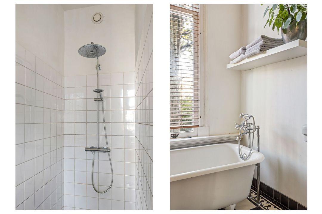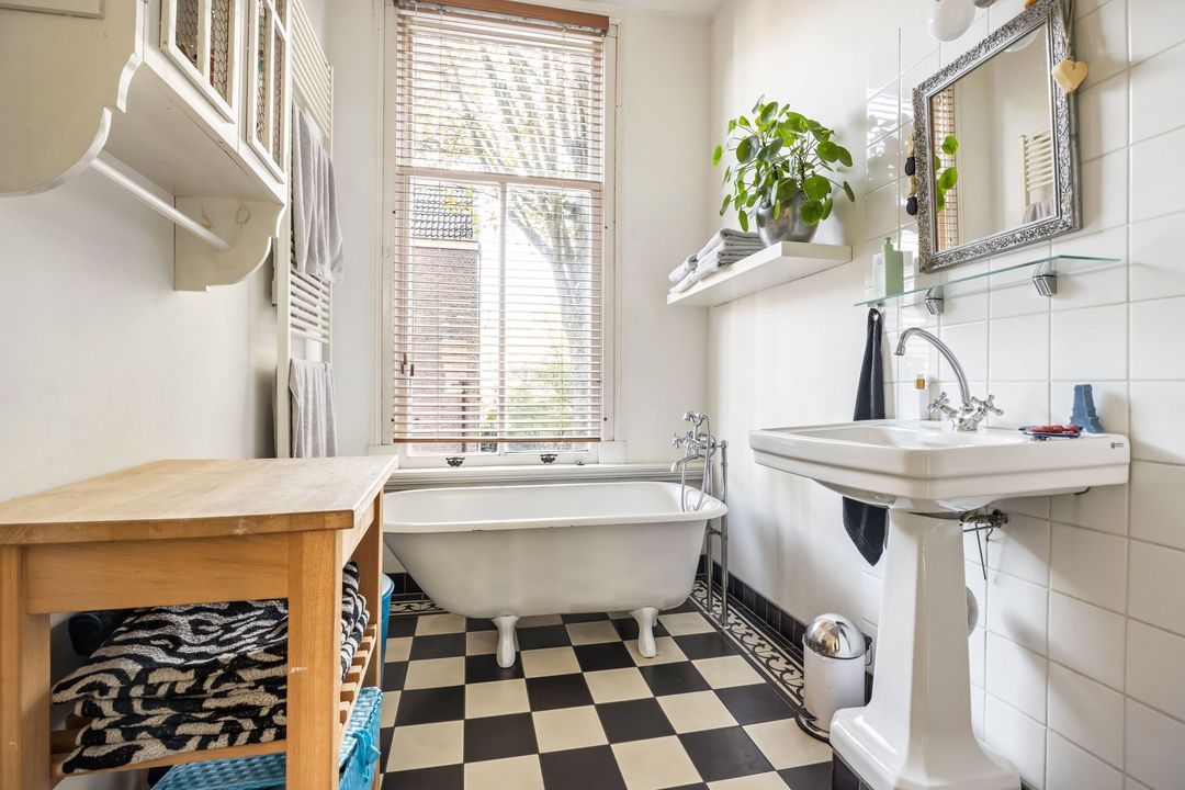 De badkamer op deze verdieping is voorzien van een vrijstaand ligbad, regendouche, wastafelmeubel en een groot raam voor prettig daglicht. De zwart-witte tegelvloer sluit perfect aan bij de stijl van de woning.