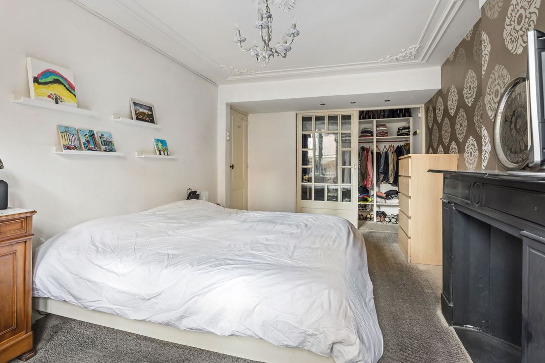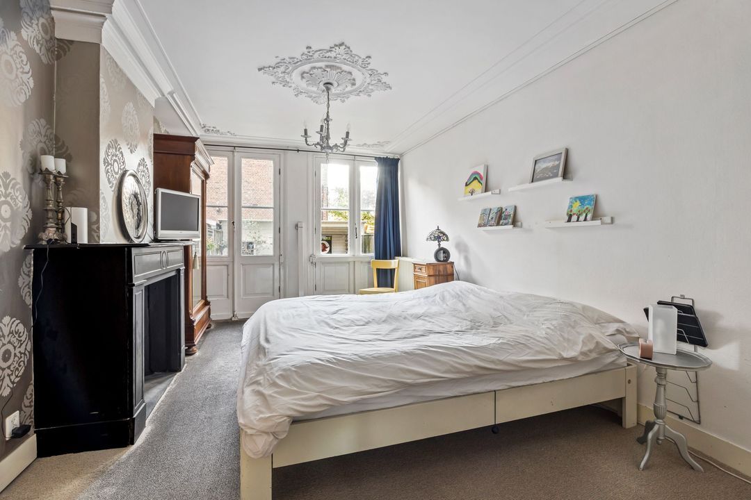 Aan de achterzijde bevindt zich de royale hoofdslaapkamer, een fijne en rustige ruimte met een originele schouw, sierplafond, praktische inloopkast en openslaande deuren naar de tuin (waarvan één met hor).