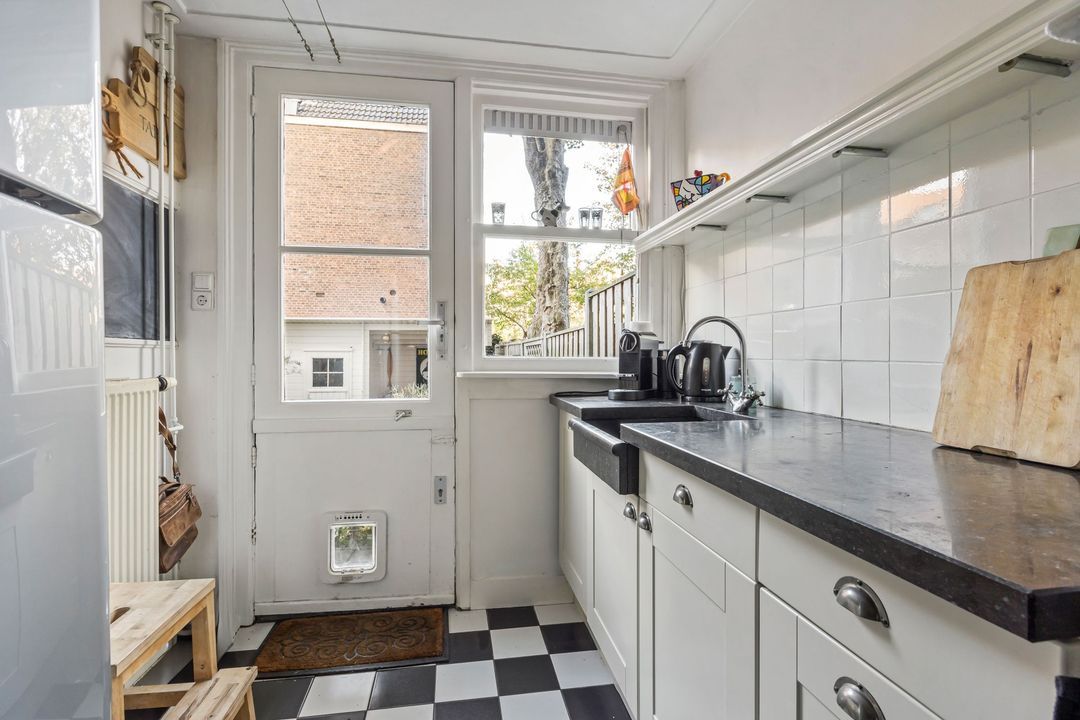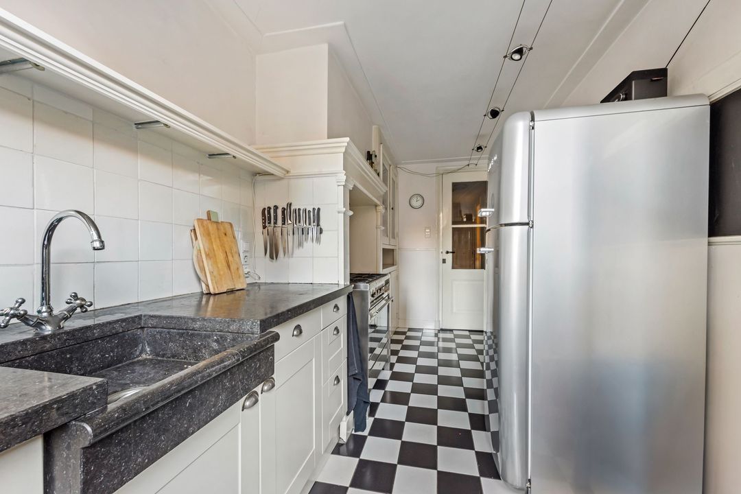 Het souterrain is verrassend ruim en praktisch ingedeeld, met behoud van sfeer en comfort. De keuken is compact en sfeervol, voorzien van een 6-pits Smeg gasfornuis met oven, vaatwasser, een vaste servieskast, koelkast (ter overname) en voldoende kastruimte. Een warme en knusse plek voor wie graag kookt in een karaktervolle setting.