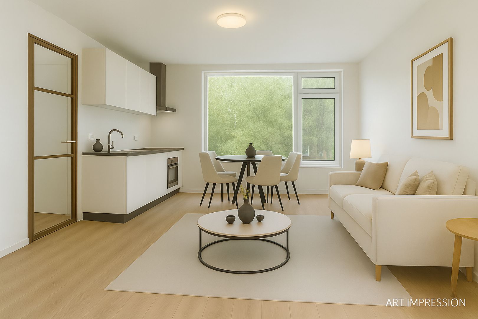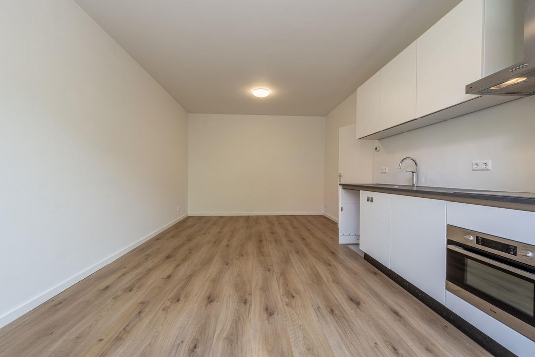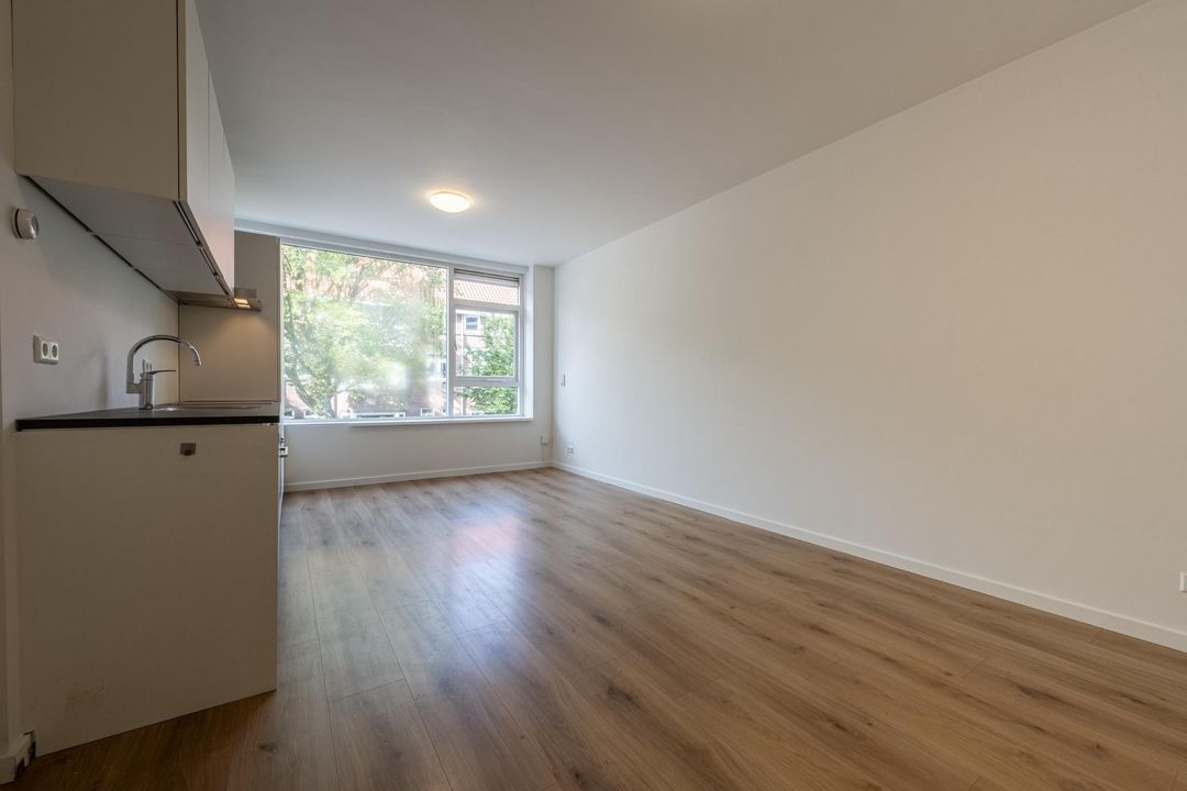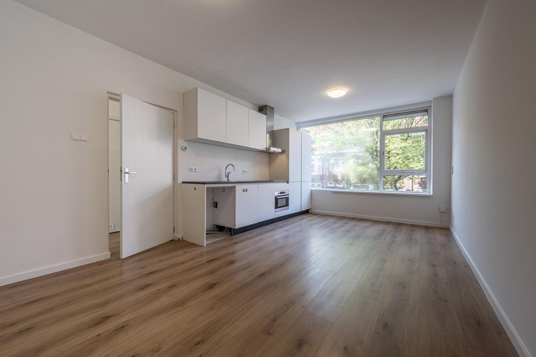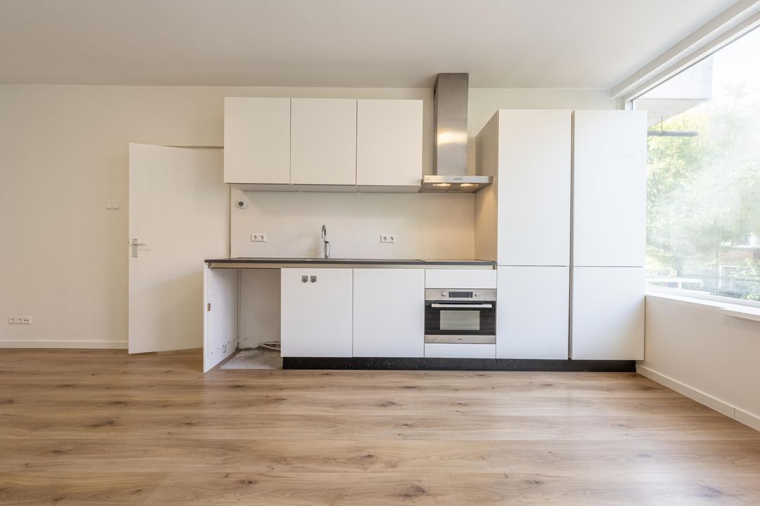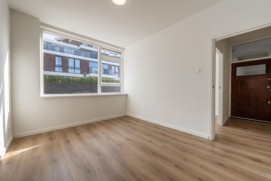 Aan de voorzijde ligt de lichte woonkamer, die direct opvalt door de grote raampartijen en de fijne lichtinval. Er is voldoende ruimte voor zowel een comfortabele zithoek als een eethoek.