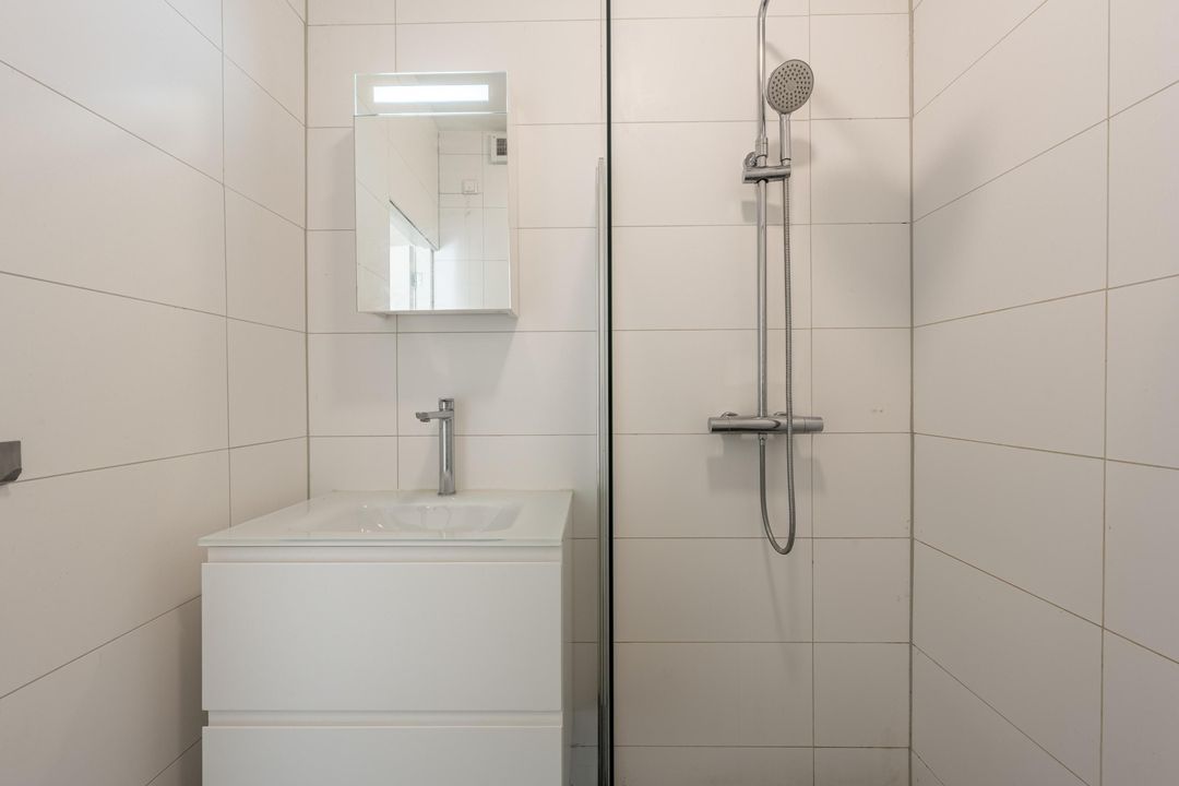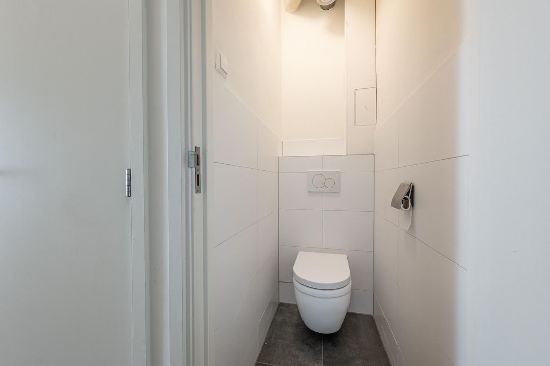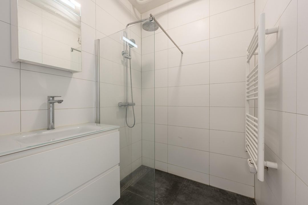 De badkamer is modern en stijlvol afgewerkt met witte wandtegels en een antraciet vloertegel. Je vindt hier een inloopdouche met zowel regen- als handdouche, een wastafelmeubel en een designradiator. Uiteraard is er mechanische ventilatie aanwezig.