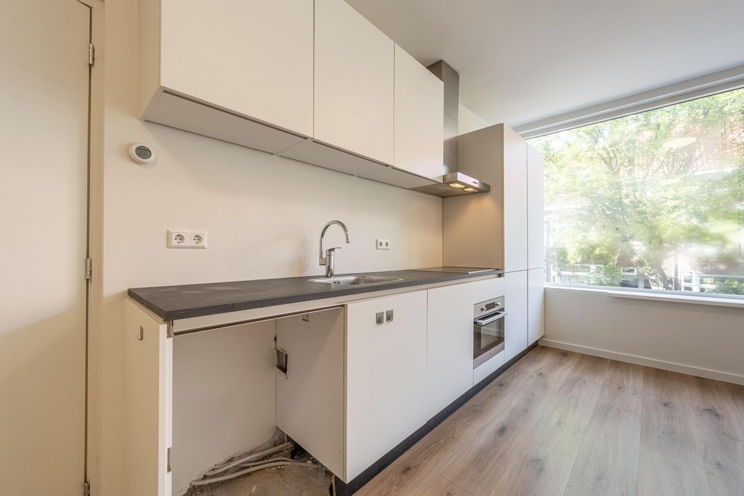 De open keuken sluit hier mooi op aan en is modern uitgevoerd met strakke witte kasten en een antraciet werkblad. Natuurlijk is de keuken compleet uitgerust met een inductiekookplaat, recirculatiekap, vaatwasser, oven en koel-vriescombinatie. Ook de cv-ketel en de aansluiting voor de wasmachine zijn hier netjes weggewerkt.
