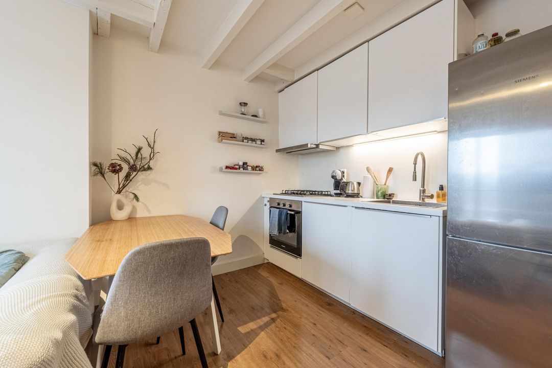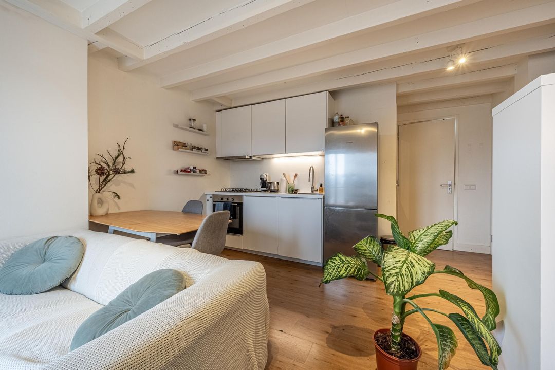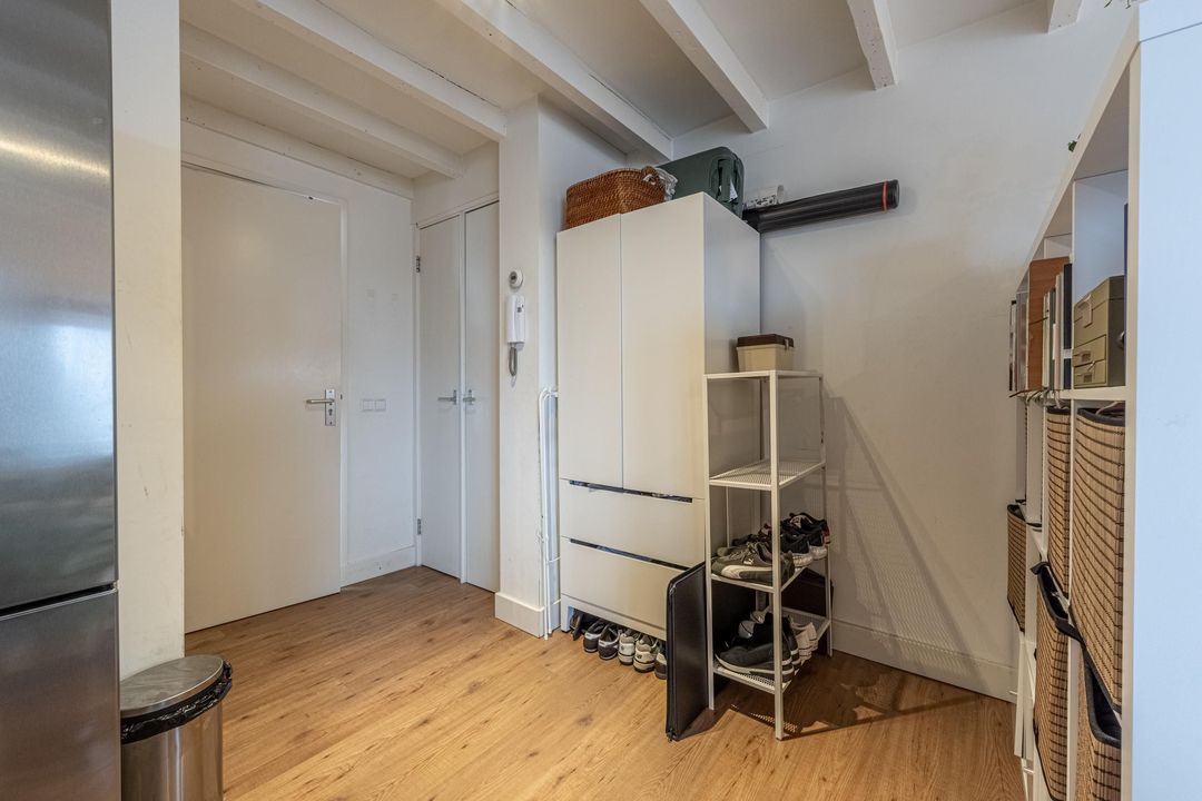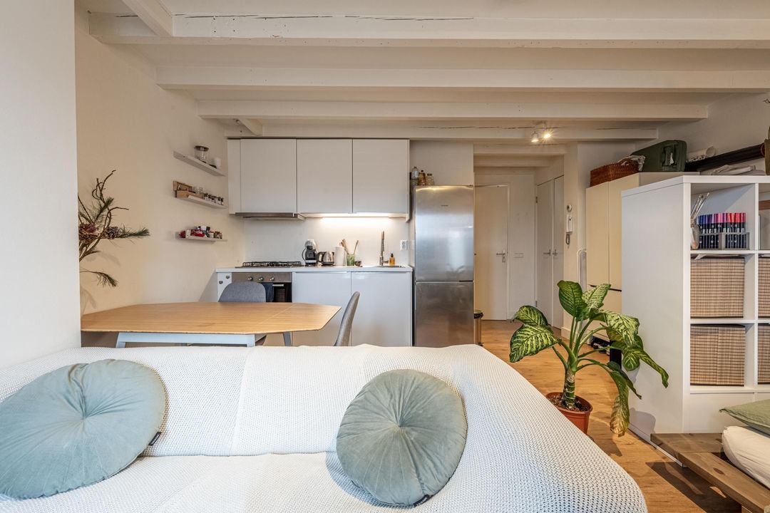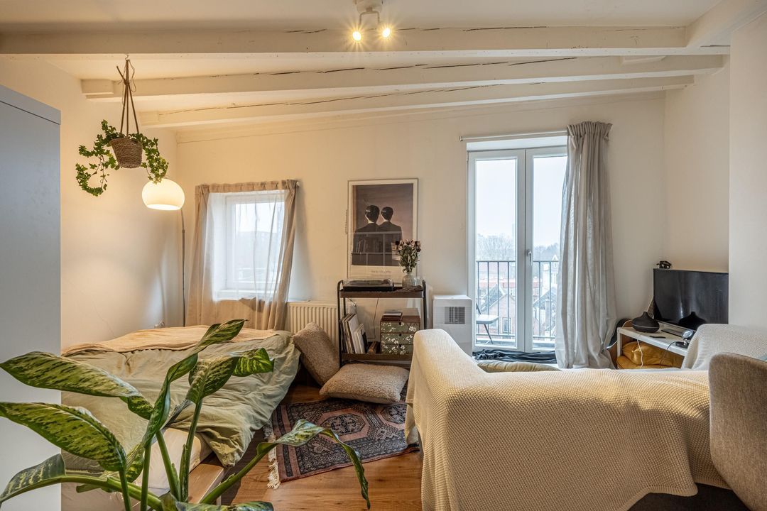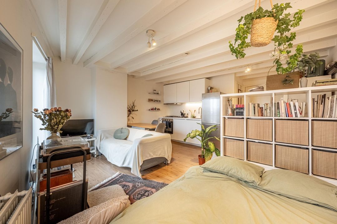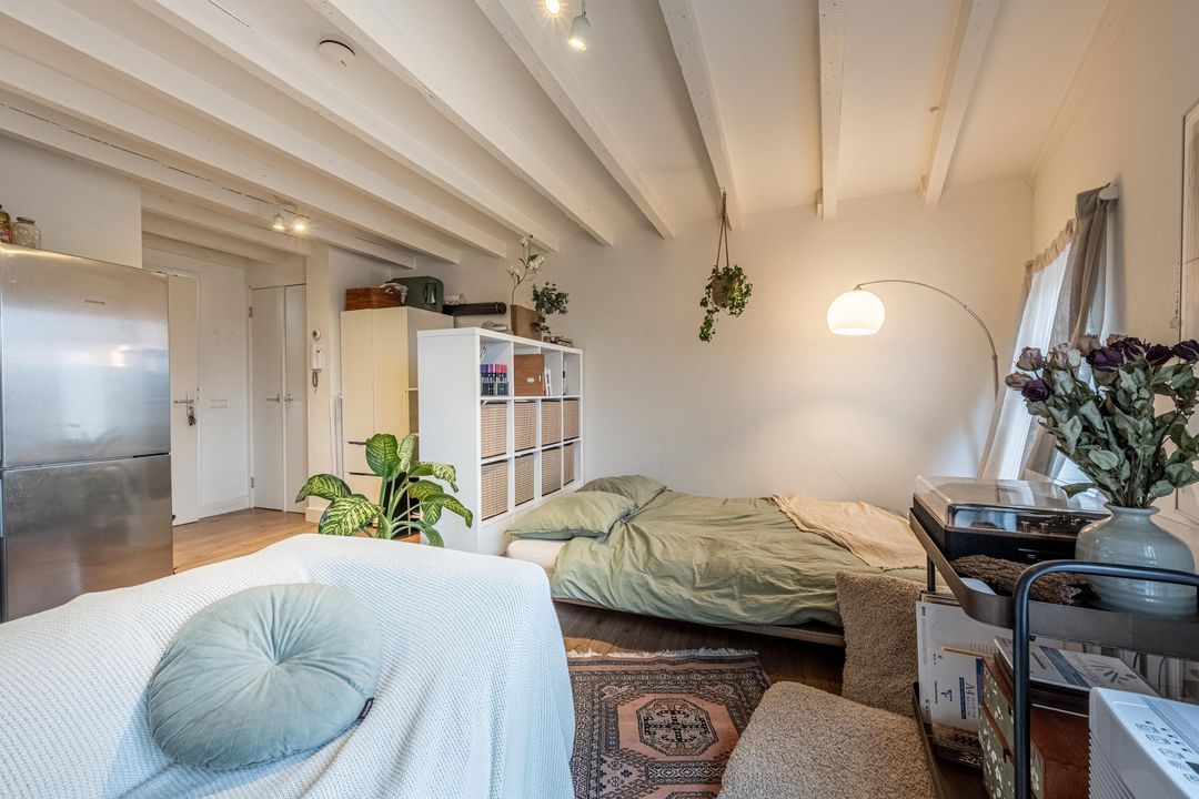 Bij binnenkomst stap je direct de studio binnen. De ruimte is afgewerkt met een bruine laminaatvloer en heeft een balkenplafond, wat zorgt voor een knusse en warme uitstraling. Dankzij de ligging op de vierde verdieping en het raam aan de voorzijde is er een prettige lichtinval en uitzicht over de straat.