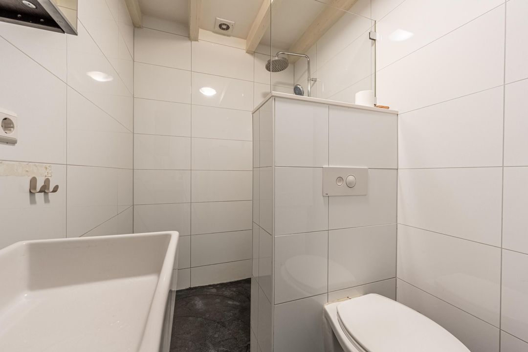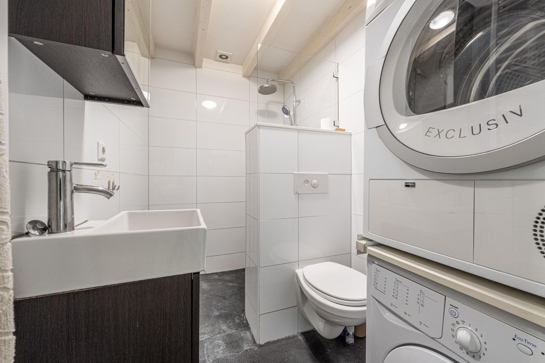 De badkamer is uitgevoerd met witte wandtegels en een grijze tegelvloer. De ruimte beschikt over een douche met regendouche, een wastafel en de opstelling voor wasmachine en droger. De cv-installatie bevindt zich in een aparte kast aan de voorzijde van de studio en betreft een Remeha Avanta uit 2014.