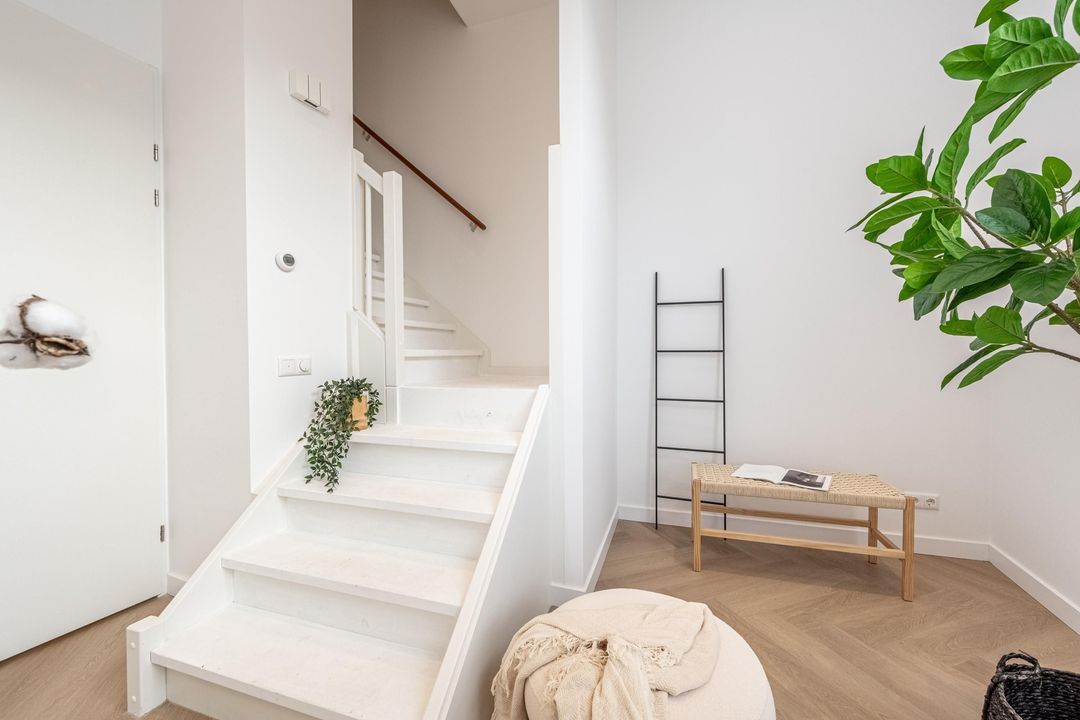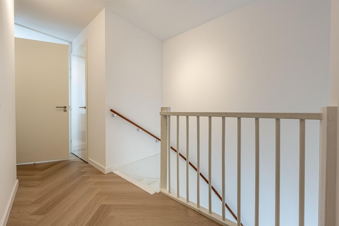 De trap leidt naar de eerste verdieping. Hier kom je op de overloop met toegang tot de berging/wasruimte.