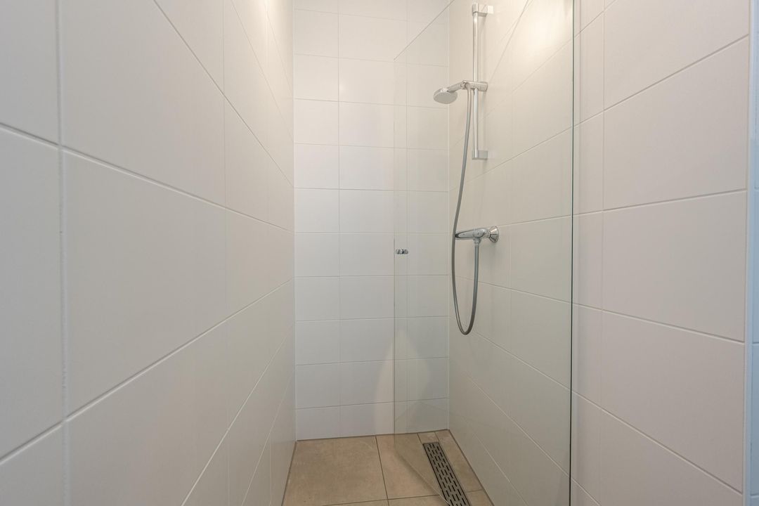 De badkamer is modern afgewerkt en voorzien van wand- en vloertegels, een wastafelmeubel, verlichte spiegel, designradiator en een inloopdouche.