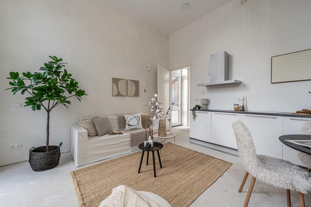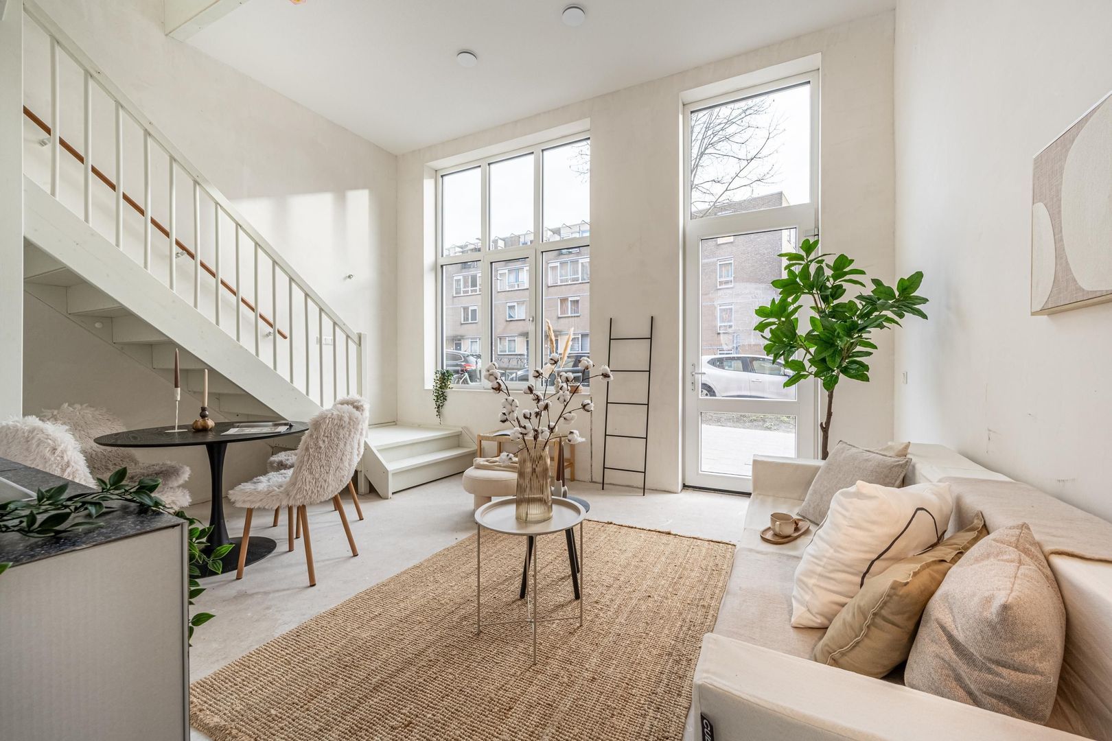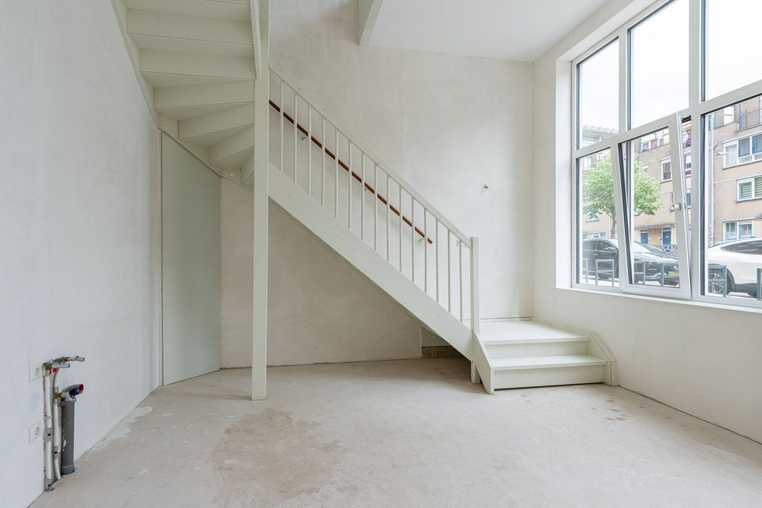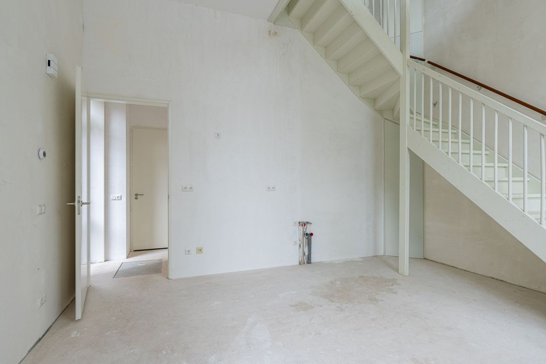 De woonkamer valt direct op door de hoge plafonds, het vele licht en de grote raampartijen. Op de begane grond is de aansluiting voor de keuken, klaar om naar eigen wens in te richten.