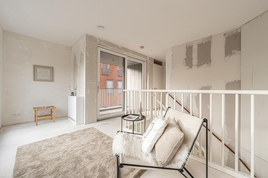 De trap leidt naar de eerste verdieping met een ruime vide. Hier heb je toegang tot het balkon aan de zijkant. Dit is een fijne plek voor een werk- of zitgedeelte. Aan de voorzijde zorgen twee Franse balkons voor extra lichtinval.