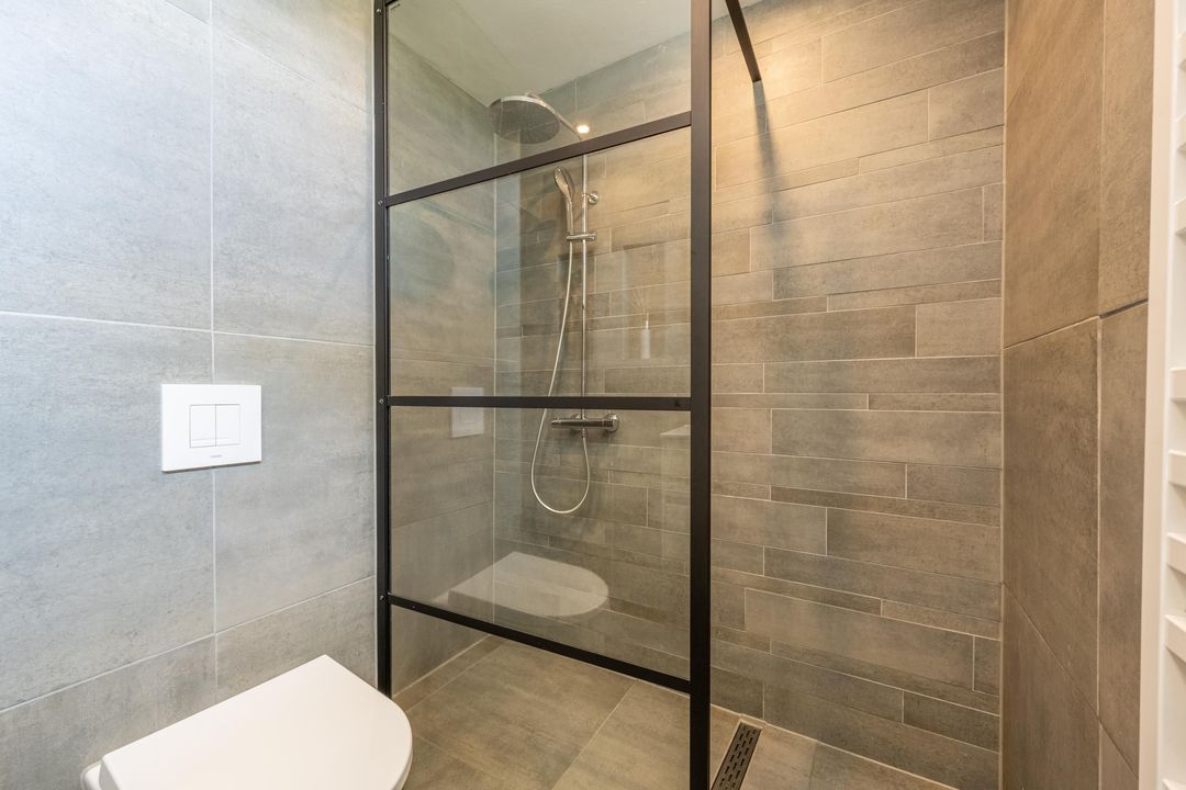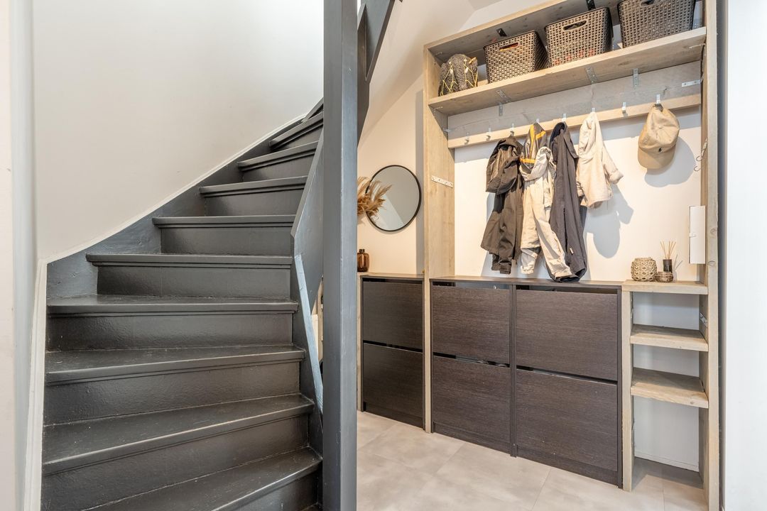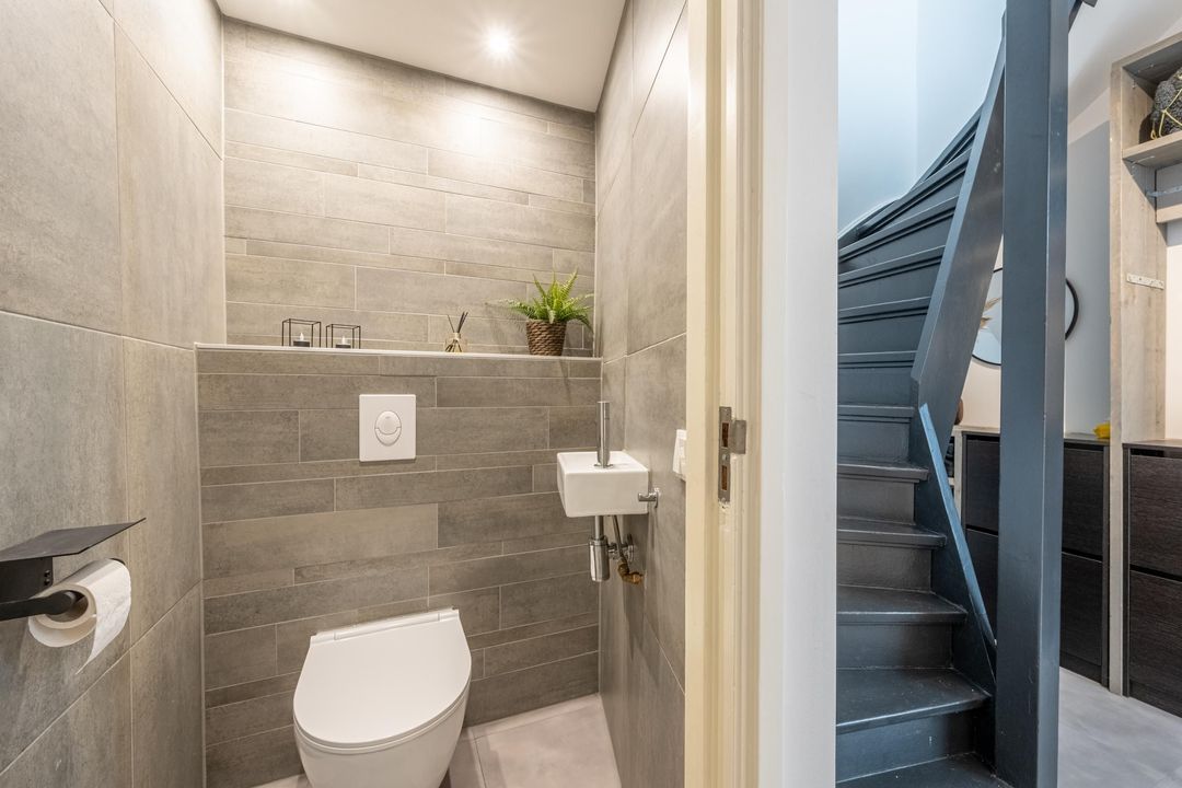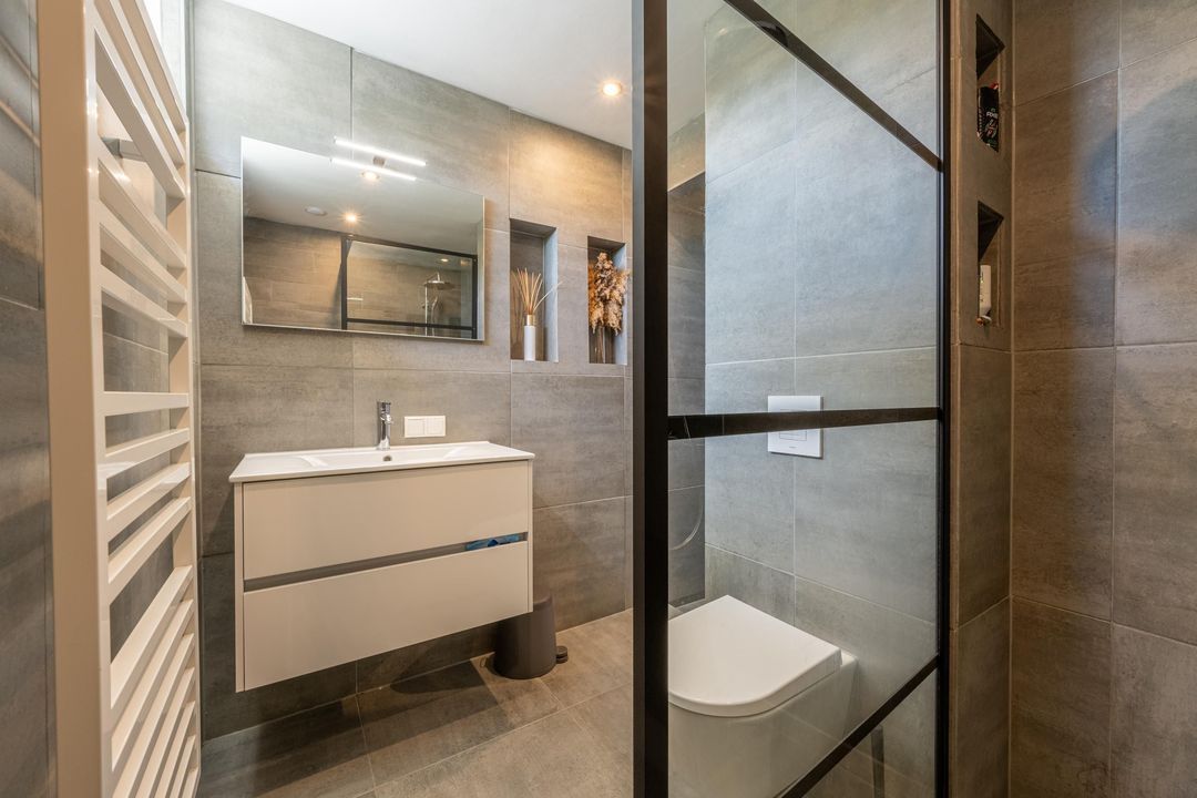 Daarnaast is er een moderne badkamer met inloopdouche, wastafelmeubel, toilet, design radiator, spots en muziekspeaker. De aparte wasruimte is praktisch ingericht met wasmachine- en drogeropstellingen en de cv-ketel.