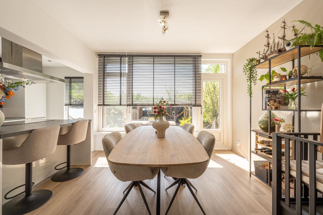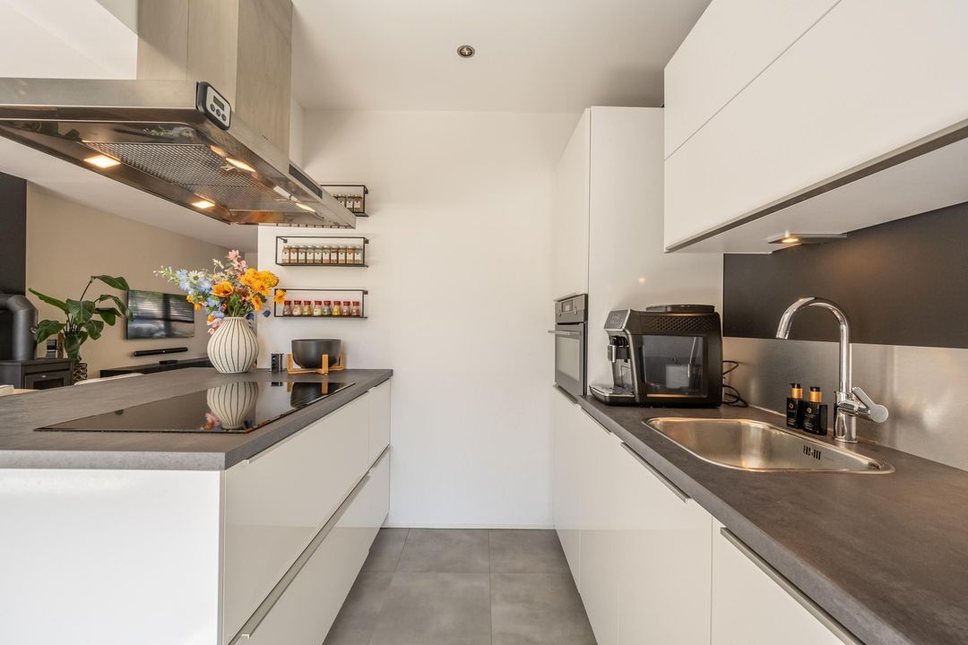 Aan de achterzijde is de vrijstaande eettafel gesitueerd met aangrenzend de moderne open keuken. De keuken is voorzien van een wandopstelling ingericht met een combi magnetron, koel-vriescombinatie en vaatwasser. Het kookeiland herbergt de inductiekookplaat met afzuigkap en heeft ruimte voor 2 personen om gezellig plaats te nemen aan de bar.