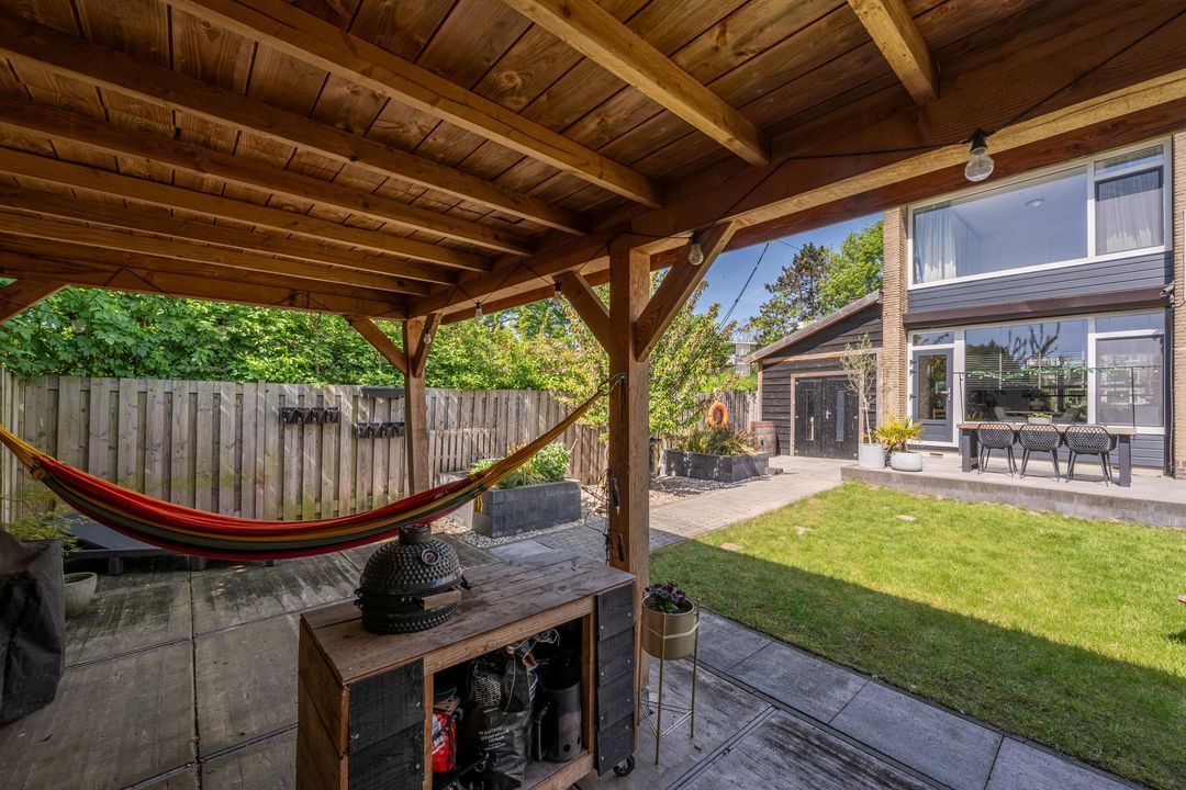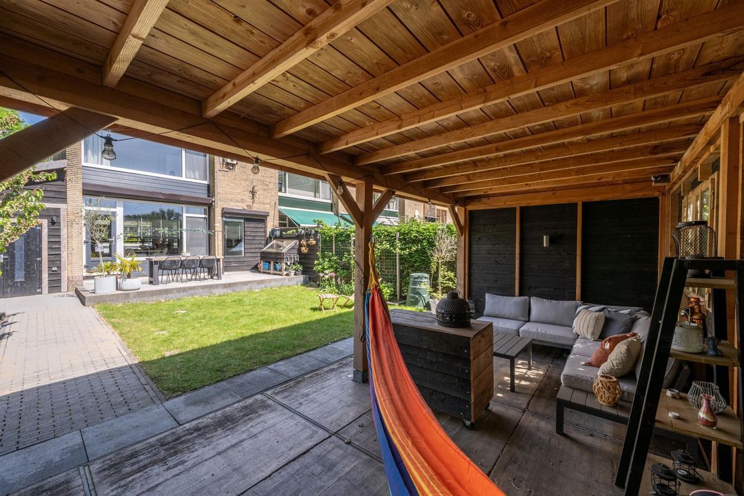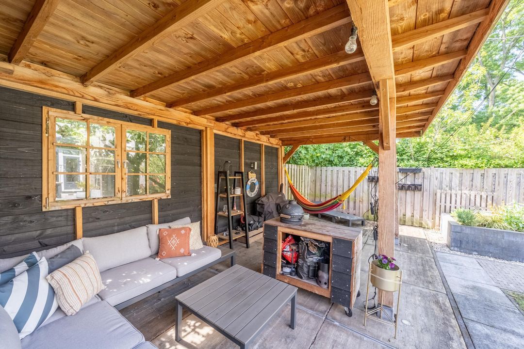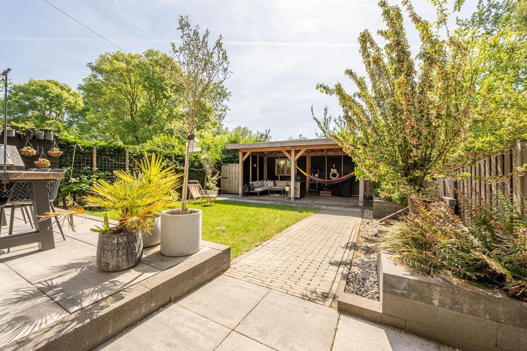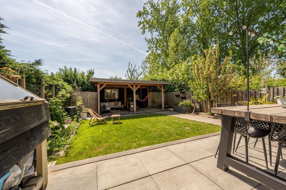 De achtertuin is een waar paradijs voor buitenliefhebbers! De ligging op het zonnige zuiden en de breedte van de tuin zorgen ervoor dat je hier de hele dag door een plekje in de zon kunt vinden. Er is een fijn terras, groot gazon en volwassen beplanting. De overkapping achterin de tuin is de kers op de taart en heeft voldoende ruimte voor een lounge set en de BBQ: een heerlijke plek om te ontspannen.