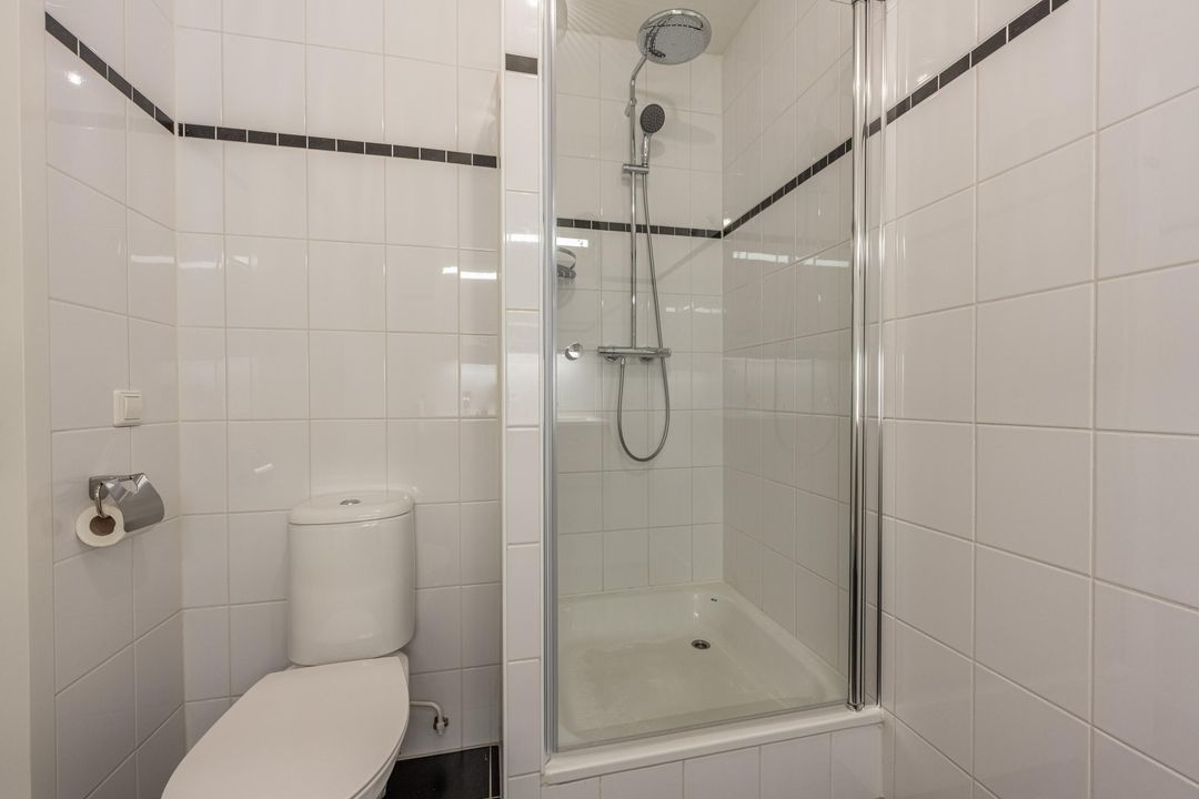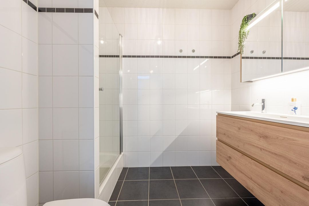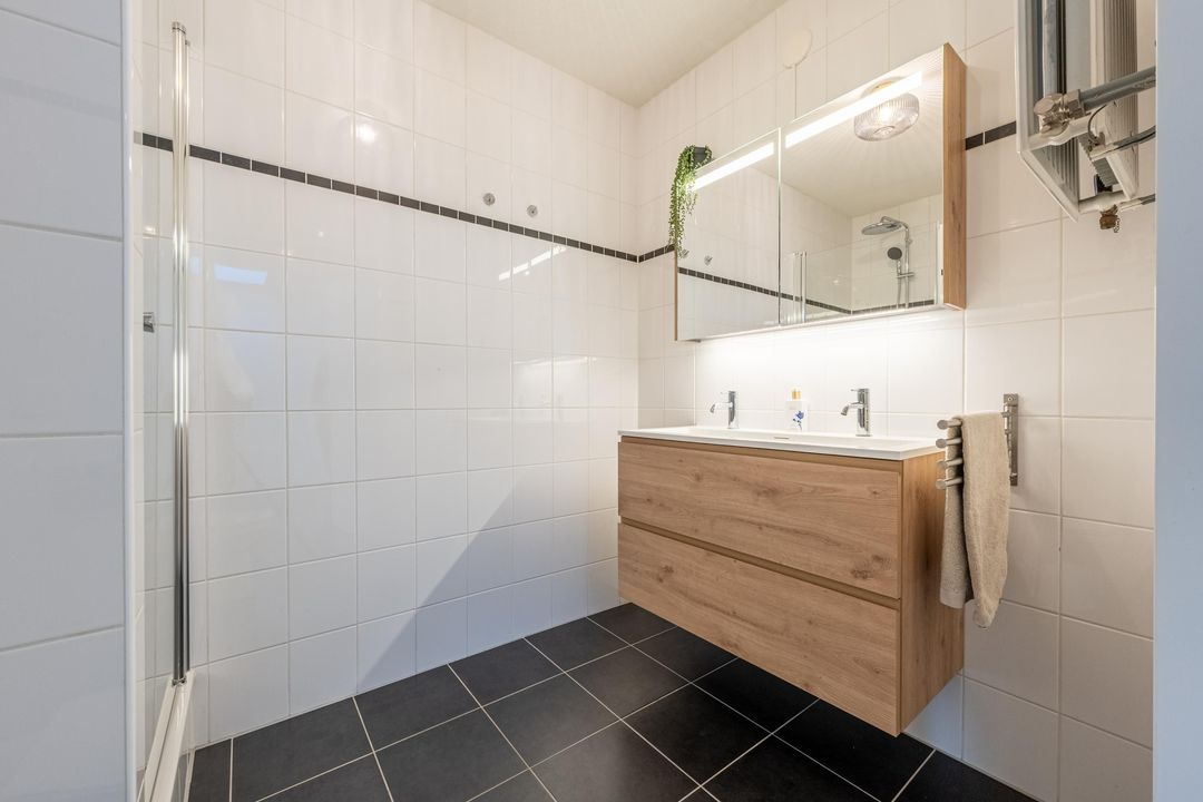 De badkamer is strak en volledig betegeld, met een douche met regenkop en handdouche, dubbel wastafelmeubel en toilet. De badkamer is afgewerkt in een zwart/witte kleurstelling.