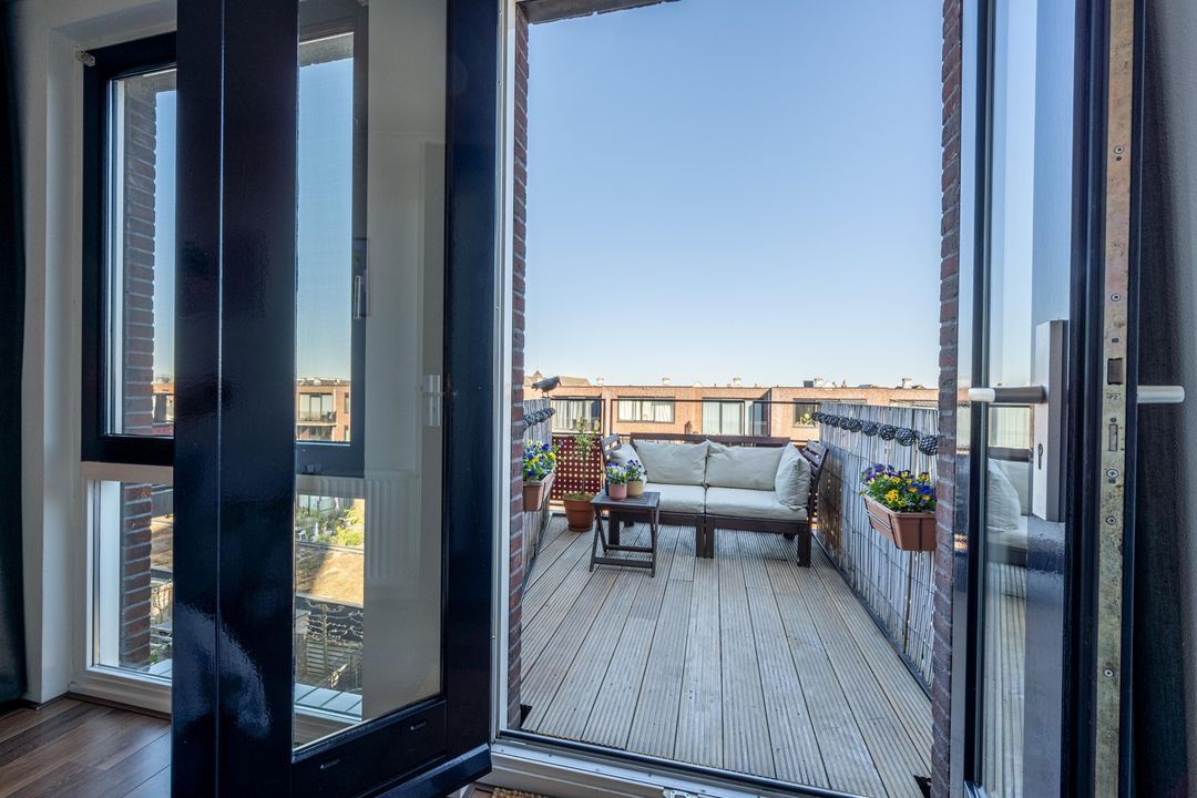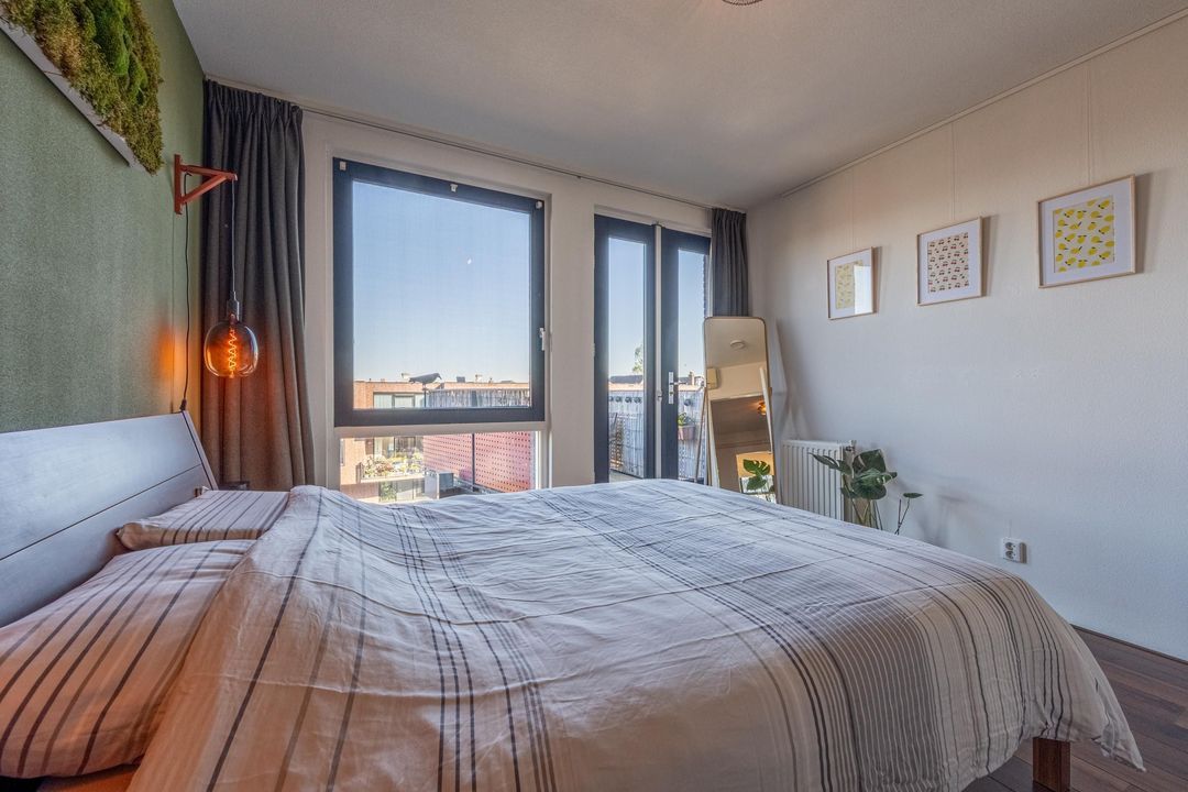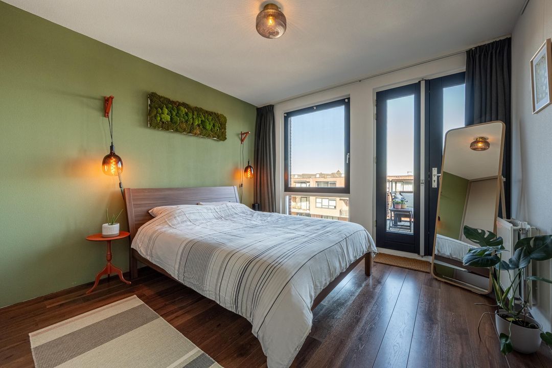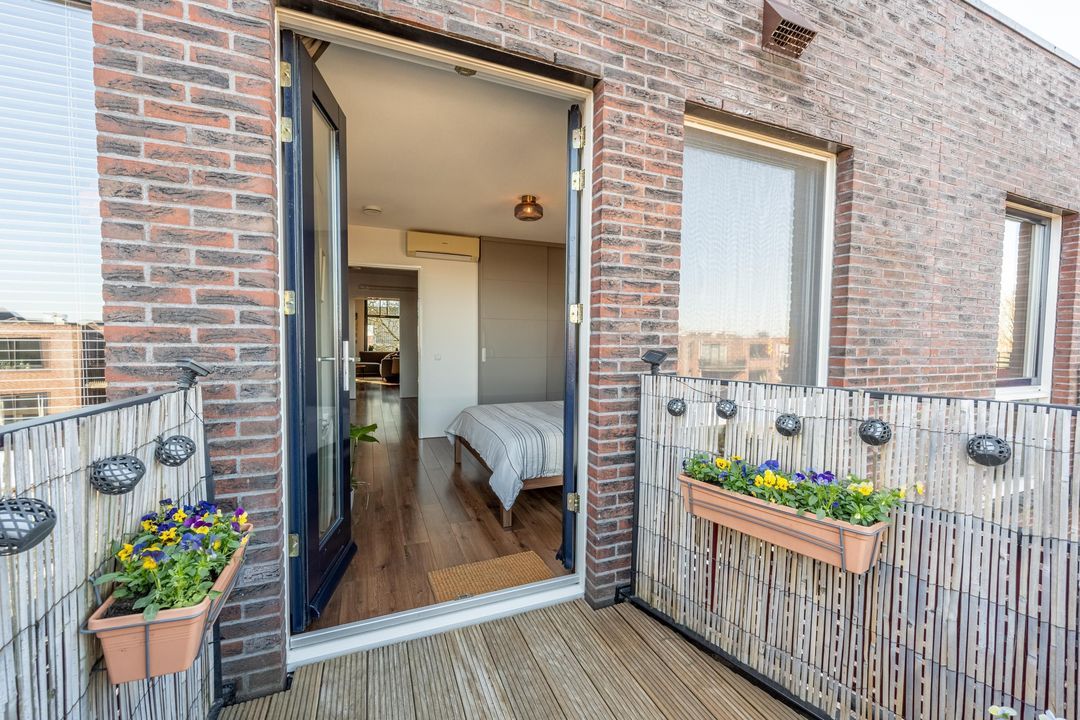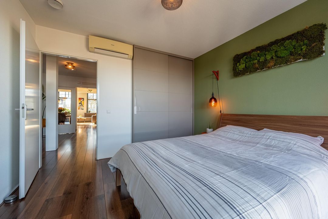 Aan de achterzijde van het appartement vind je de grootste slaapkamer (ca. 13,5 m²), met een comfortabele airconditioning, openslaande deuren naar een fijn balkon met vlonderdelen van circa 4,5 m². Een rustige plek voor je ochtendkoffie of een drankje in de avondzon. Heerlijk ontspannen!