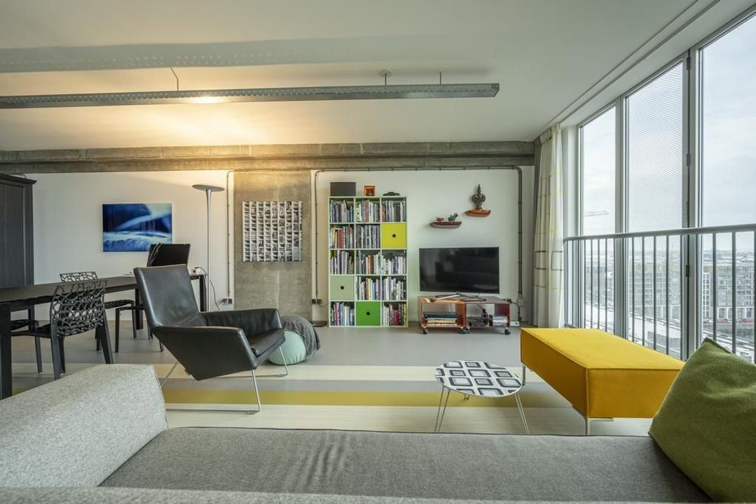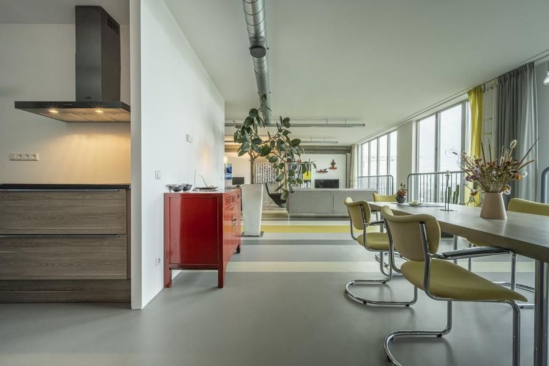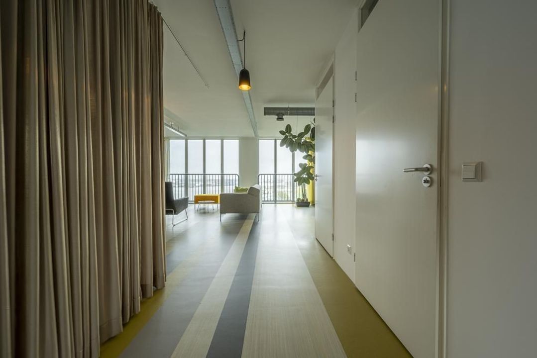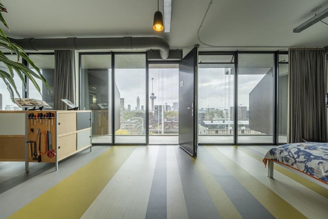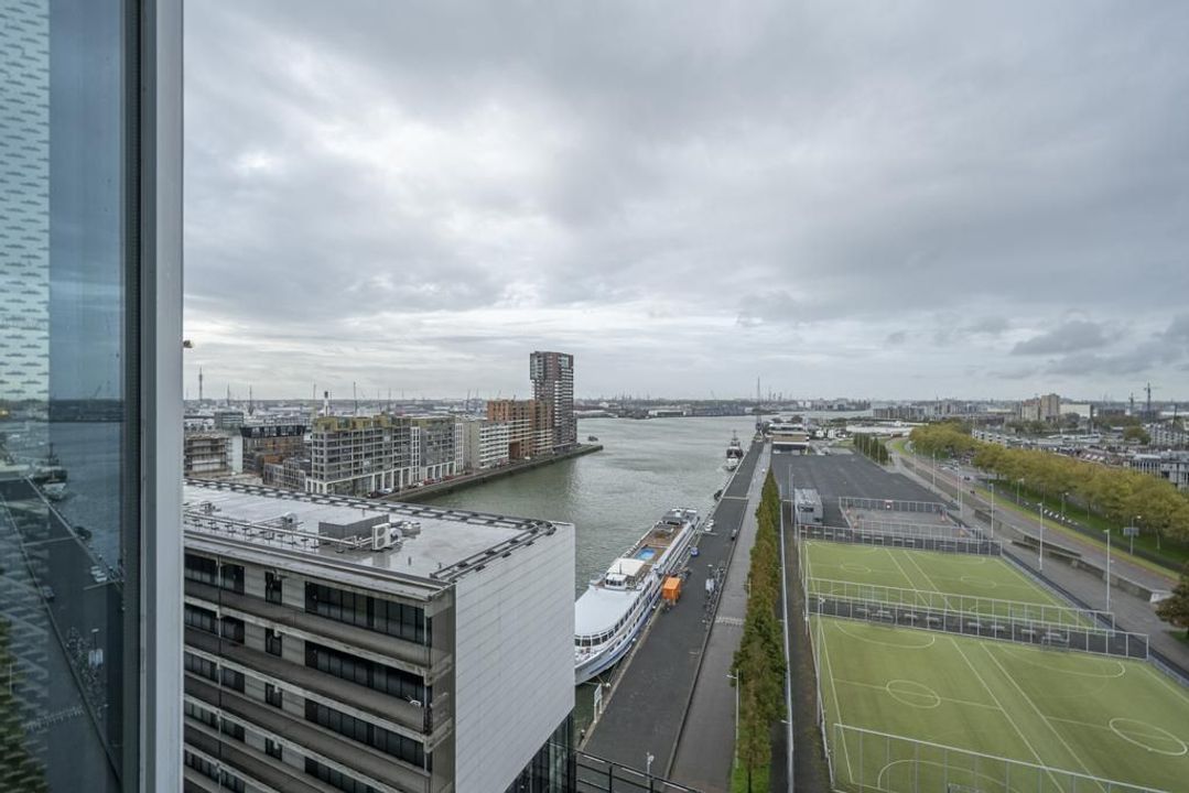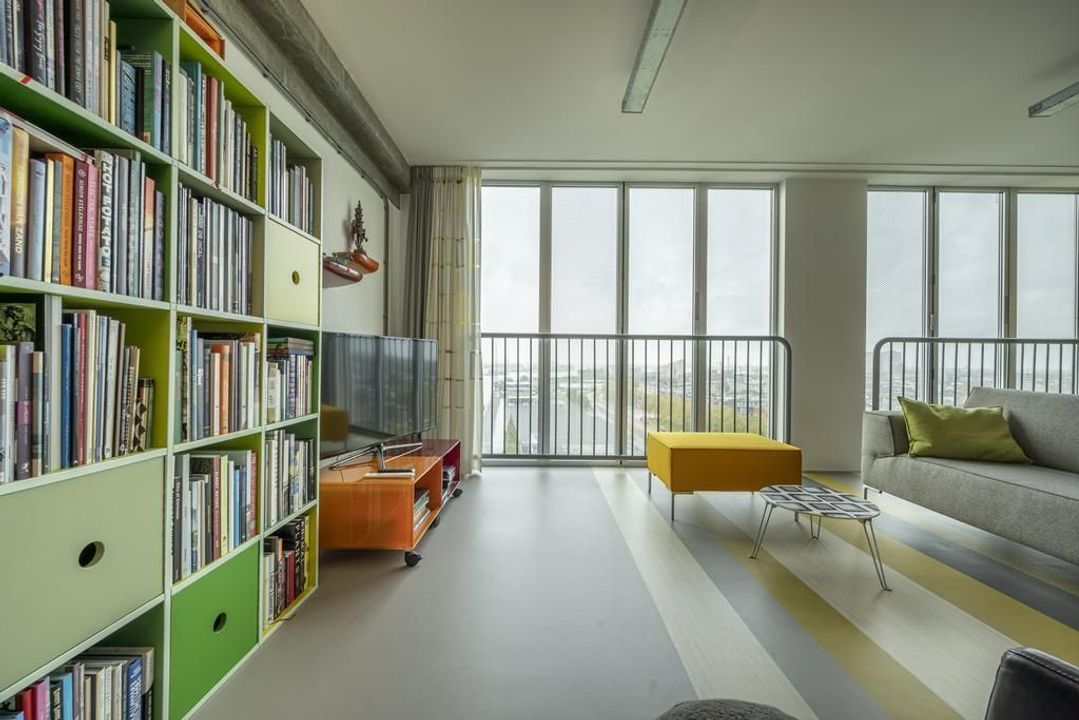 De riante living is gelegen aan de achterzijde van het appartement. Het prachtige uitzicht over de havens en het scheepvaartverkeer, continue veranderende luchten en de Rotterdamse skyline zorgen ervoor dat je hier niet snel uitgekeken raakt. Open daarbij op een mooie zomerse dag de raampartij van de harmonicadeuren het en bruisende buitenleven wordt naar binnen gehaald. Hier kun je uit je werk genieten van de meest prachtige zonsondergangen.