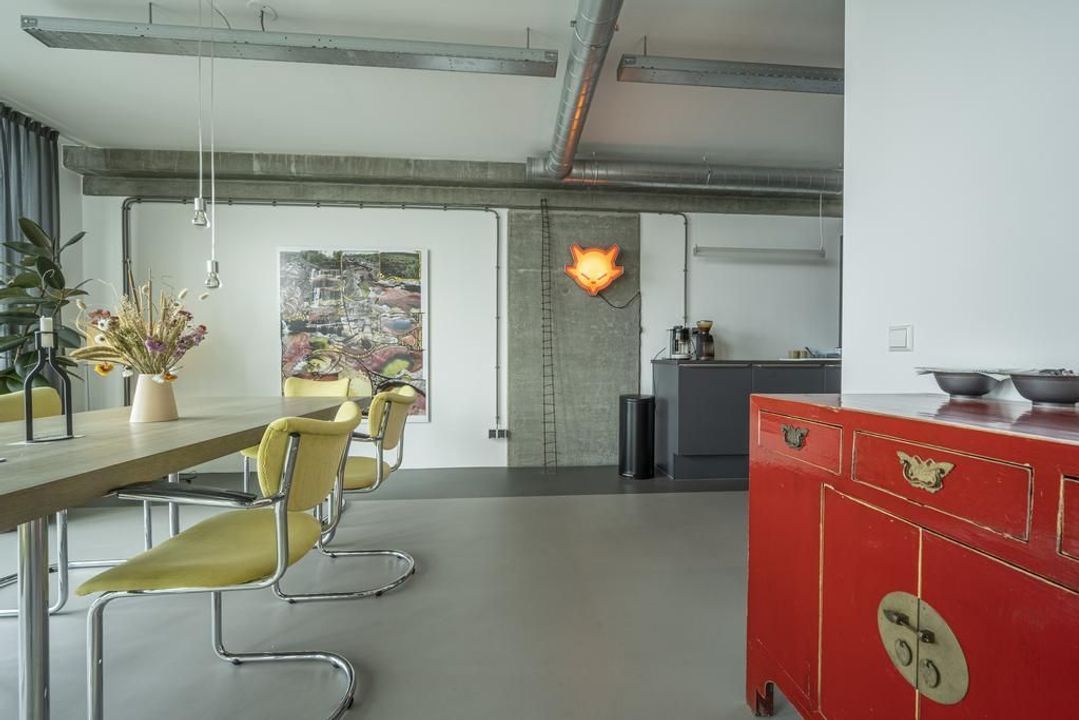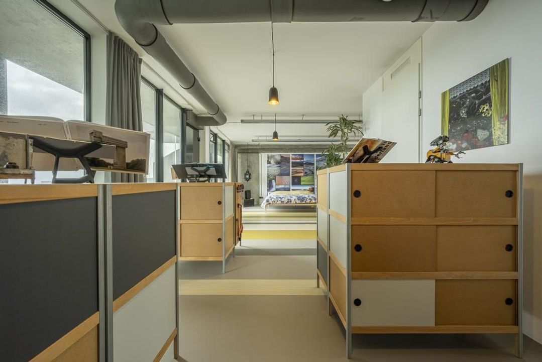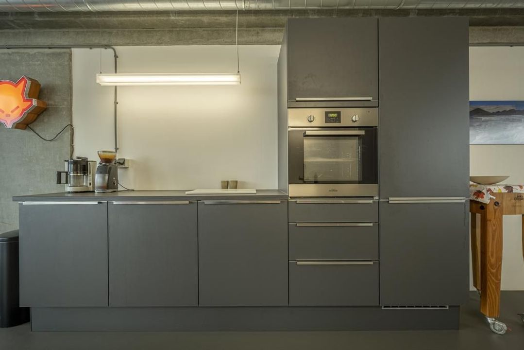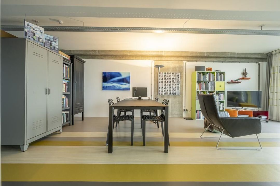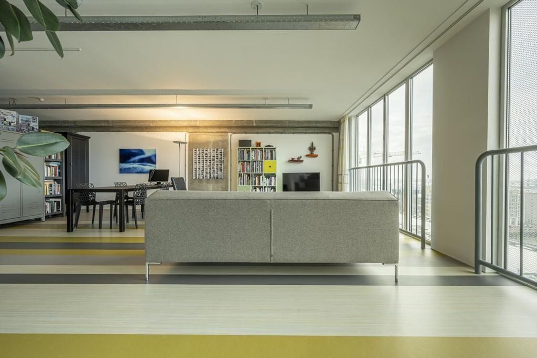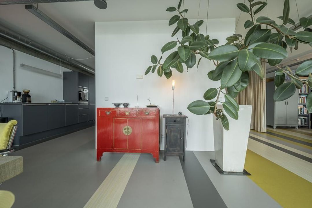 De riante living is gelegen aan de achterzijde van het appartement. Het prachtige uitzicht over de havens en het scheepvaartverkeer, continue veranderende luchten en de Rotterdamse skyline zorgen ervoor dat je hier niet snel uitgekeken raakt. Open daarbij op een mooie zomerse dag de raampartij van de harmonicadeuren het en bruisende buitenleven wordt naar binnen gehaald. Hier kun je uit je werk genieten van de meest prachtige zonsondergangen.