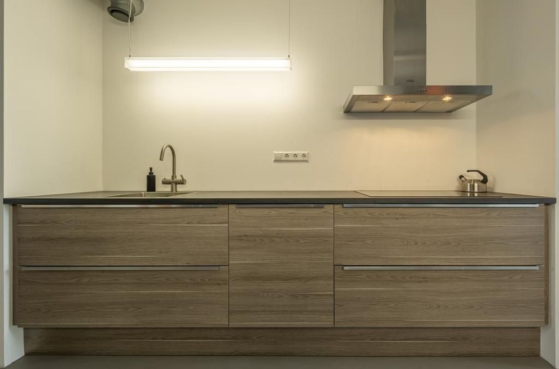 De moderne en open Bruynzeel keuken staat in directe verbinding met het royale eetgedeelte. Hierdoor kun je je kookkunsten vertonen en toch betrokken blijven bij het gesprek van je familie en vrienden. De keuken in afgewerkt met houtlook/grijze keukenkasten en lades, uiteraard is er de benodigde inbouwapparatuur aanwezig namelijk; inductiekookplaat met 4 kookzones en een recirculatiekap, vaatwasser, koelkast, vriezer en een oven.