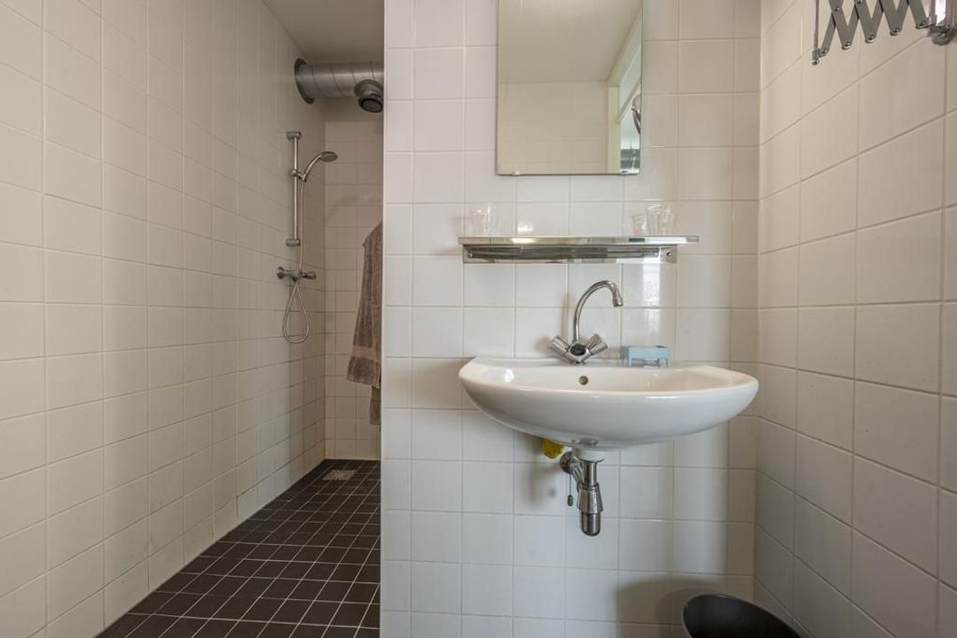 De nette badkamer is ingericht met een inloopdouche, wastafel en een ventilatiesysteem, daarnaast is de badkamer afgewerkt met witte wandtegels en zwarte vloertegels.