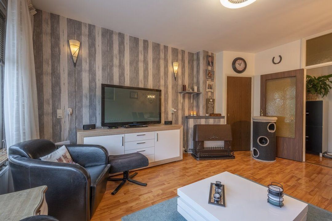 Zodra je de woonkamer binnenkomt valt direct het vrij uitzicht en prettige lichtinval op. Er is voldoende ruimte voor een eettafel en bank. Hier is ook de moederhaard en een vaste kast.