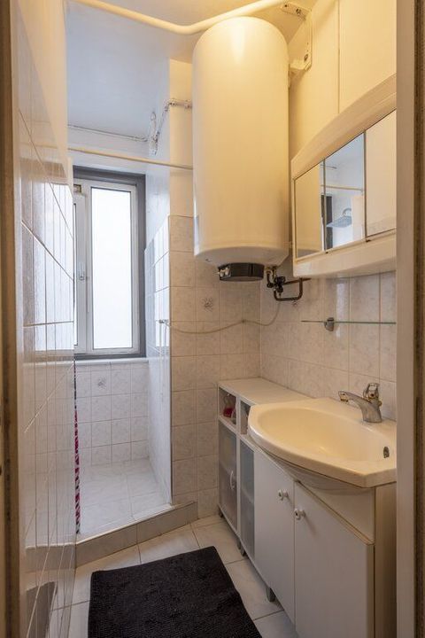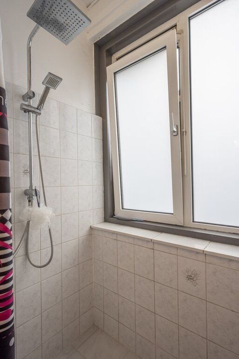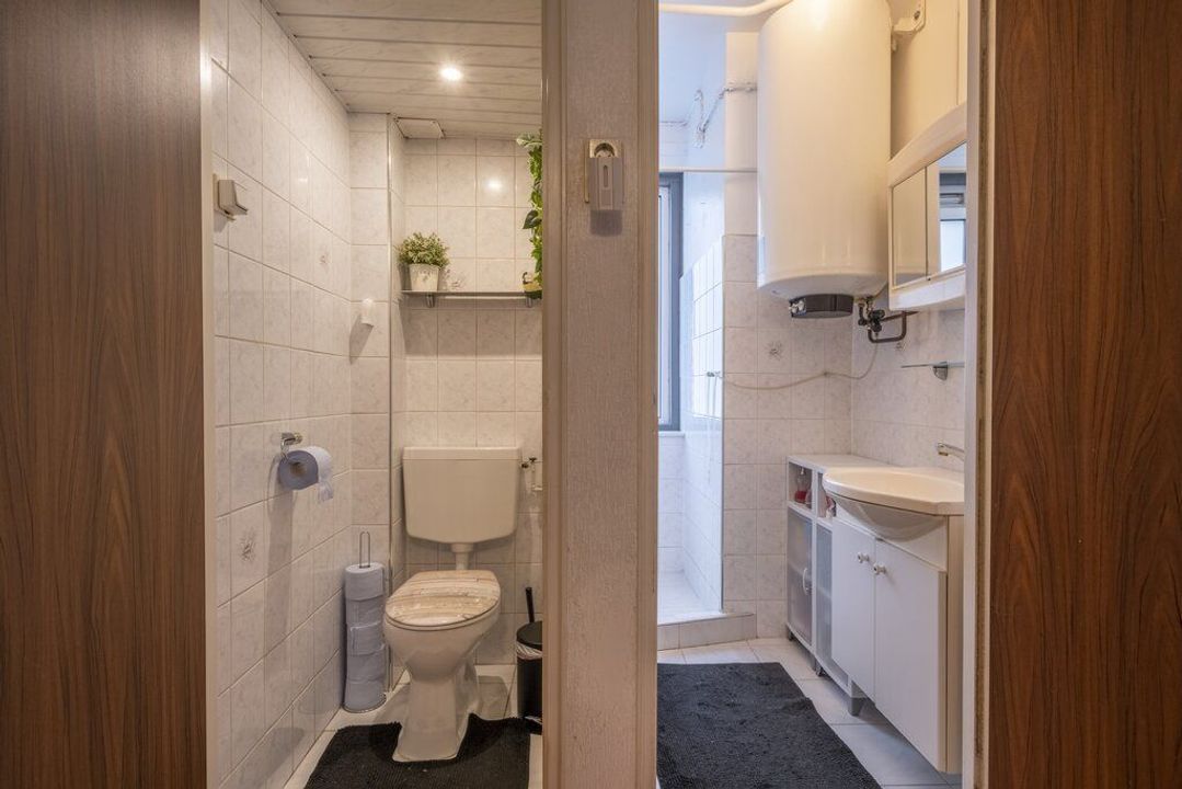 De nette badkamer is in een witte kleurstelling en ingericht met een inloopdouche, wastafel en hier heeft ook de boiler van 120liter een plekje gevonden.