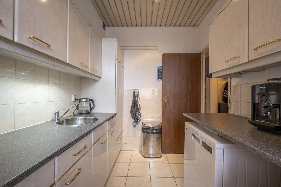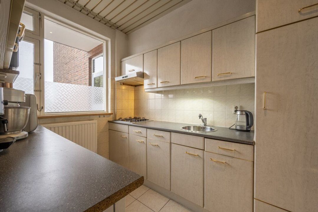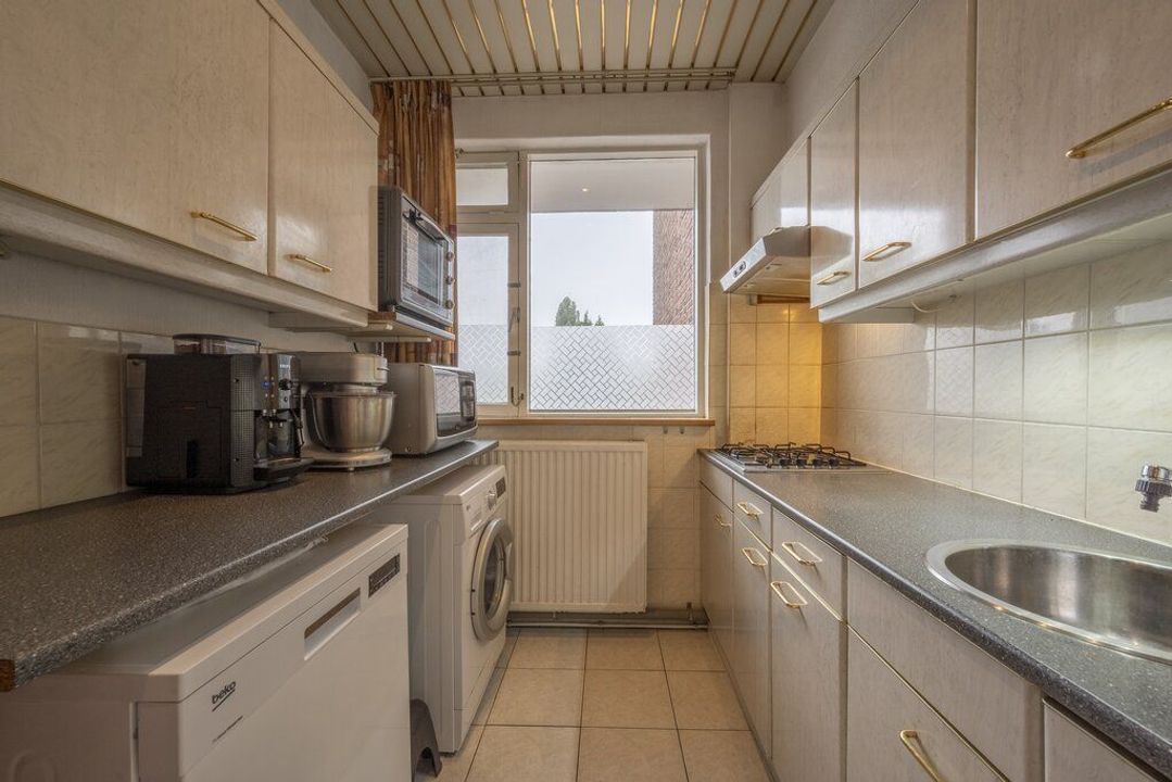 De keuken is aan de voorzijde van het appartement en ingericht met een 4-pitsgasfornuis met afzuigkap en een koelkast. Ook heeft hier de wasmachine een plekje. Daarnaast zijn er licht grijze keukenkasten en een kunststof werkblad.
