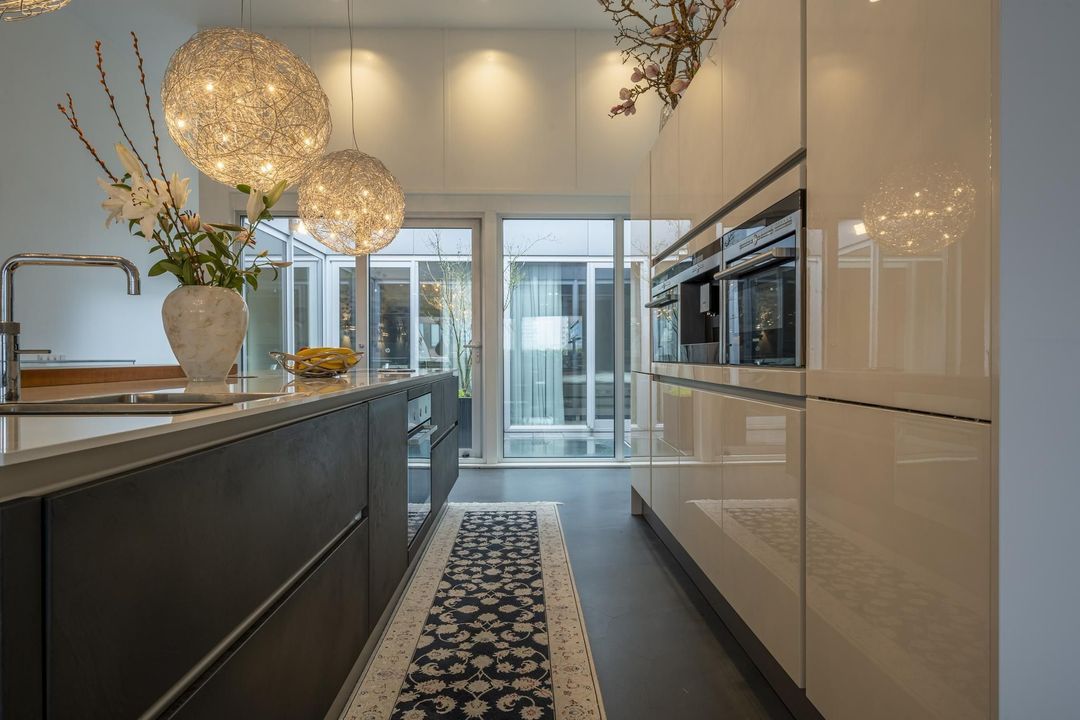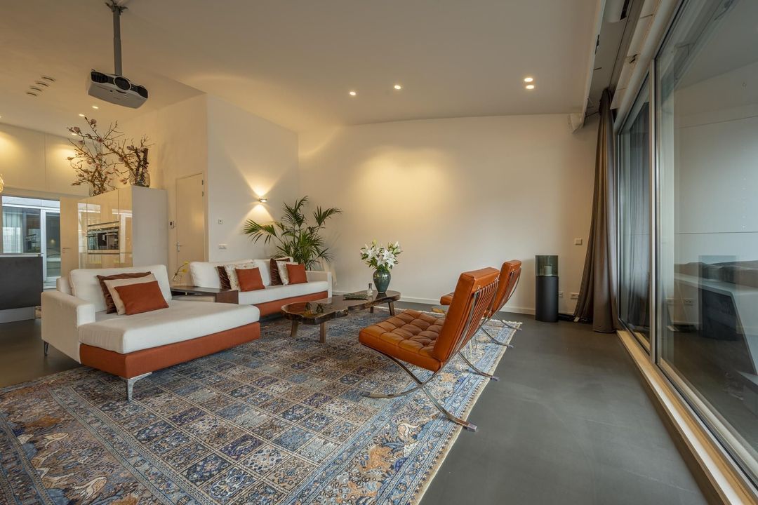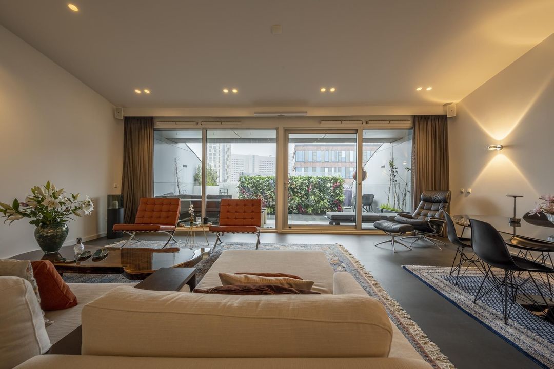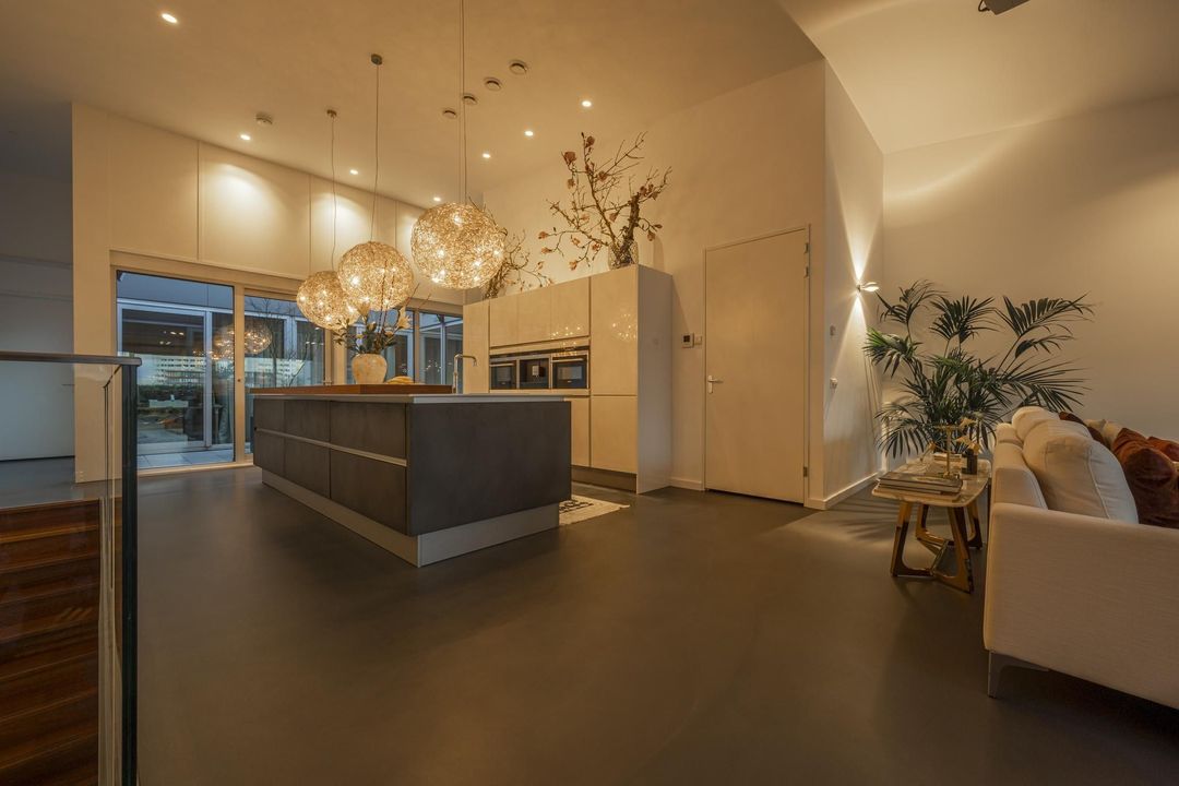 Luxe en sfeer zijn kenmerkend voor de woonkamer met een oplopend plafond tot ca. 4m hoog en direct zicht op- en toegang tot het zuidelijk gelegen dakterras. Het ruimtelijke gevoel komt terug in ruim 7m brede woonkamer met plaats voor een riante zithoek en vrijstaande eettafel, beide grenzend aan de glazen pui met toegang tot het kamerbrede dakterras. In het verlengde bevindt zich de open keuken.