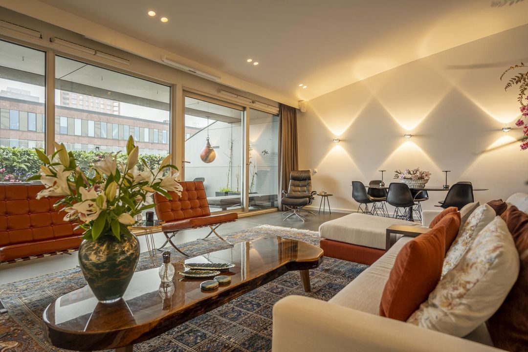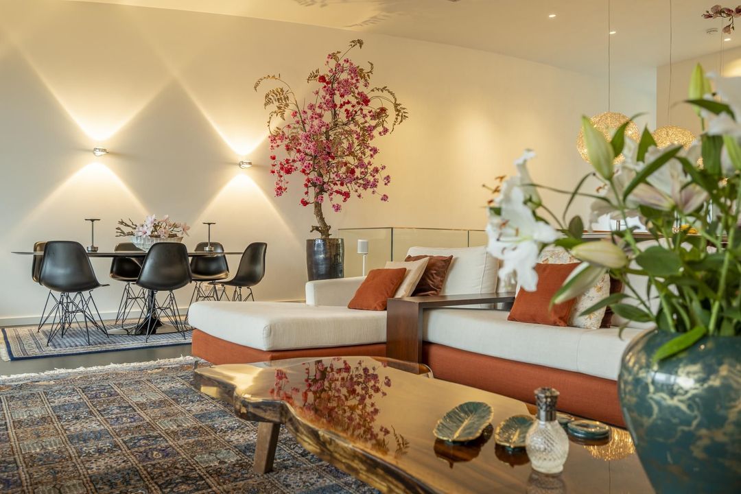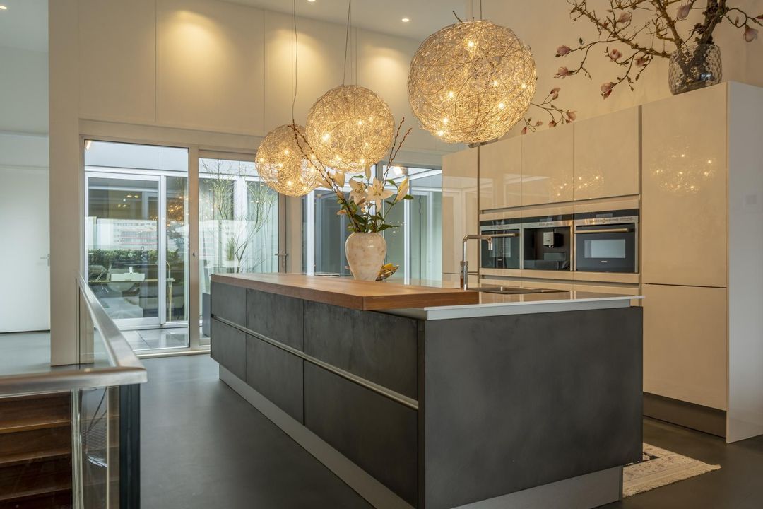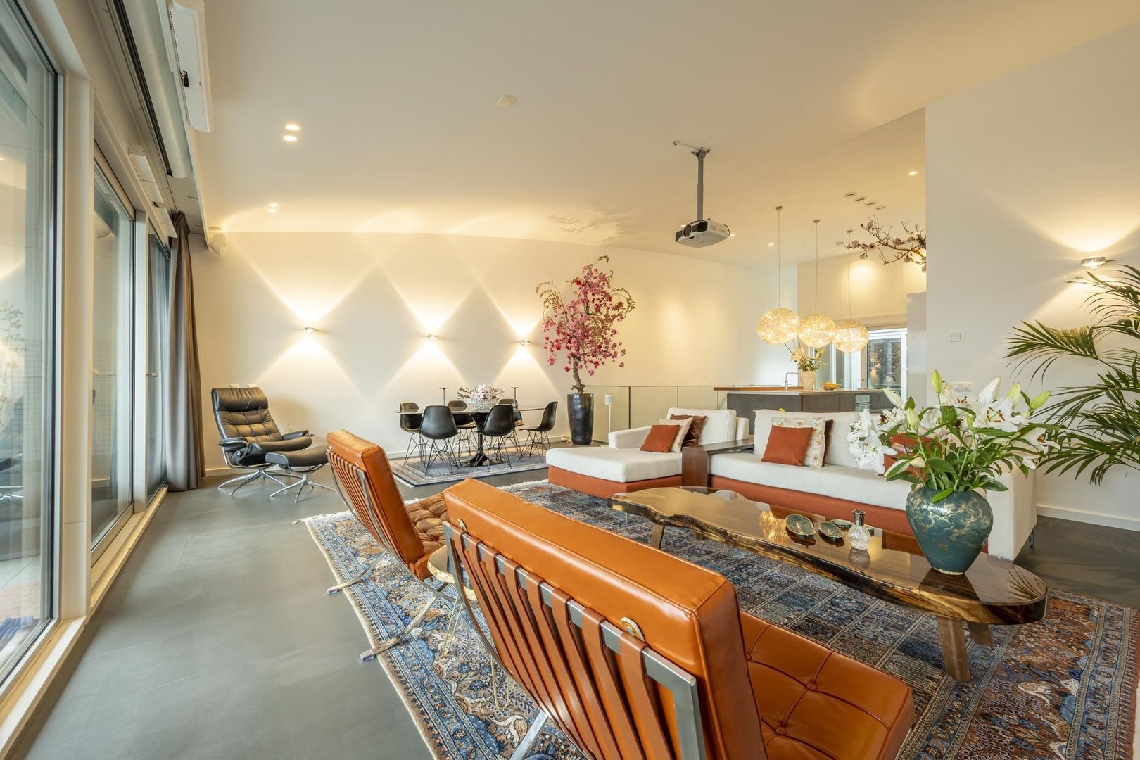 Luxe en sfeer zijn kenmerkend voor de woonkamer met een oplopend plafond tot ca. 4m hoog en direct zicht op- en toegang tot het zuidelijk gelegen dakterras. Het ruimtelijke gevoel komt terug in ruim 7m brede woonkamer met plaats voor een riante zithoek en vrijstaande eettafel, beide grenzend aan de glazen pui met toegang tot het kamerbrede dakterras. In het verlengde bevindt zich de open keuken.