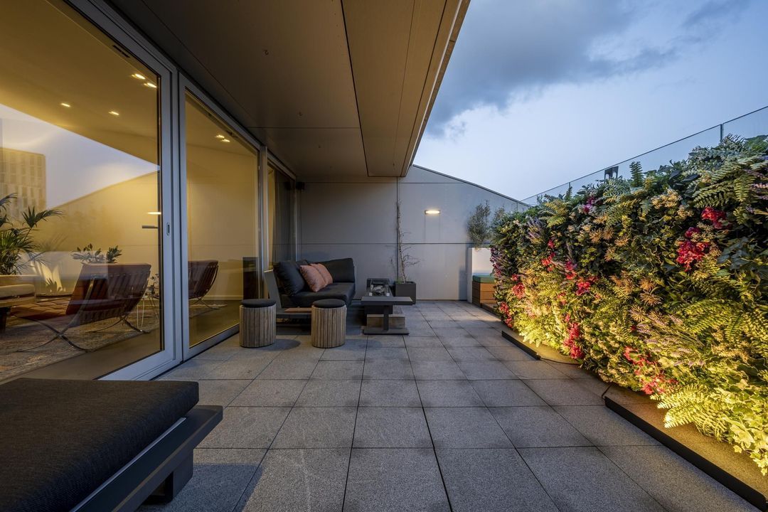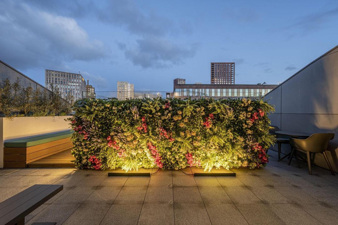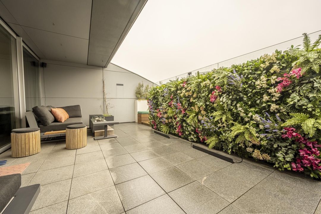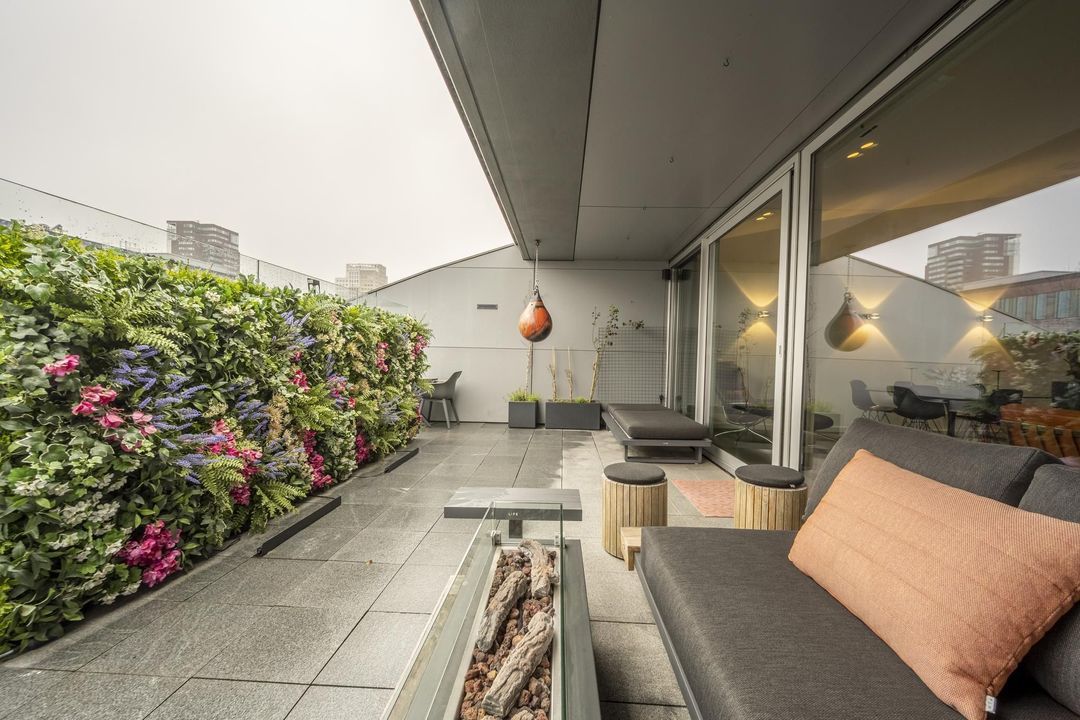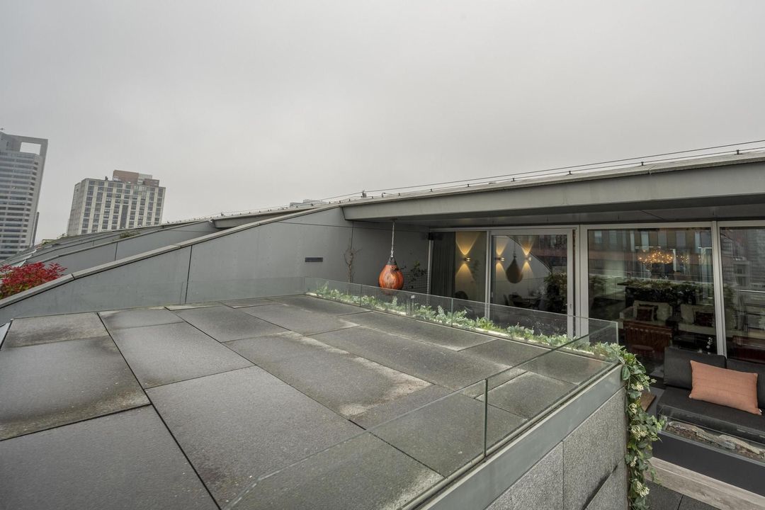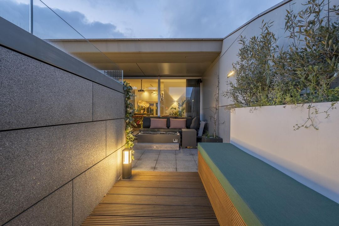 De patio (12m²) zorgt voor een prachtige lichtinval en geeft een extra dimensie aan de leefruimte. Het zuidelijk gelegen dakterras is de kers op de taart: de perfecte plek om te ontspannen, te genieten van de zon in alle rust en het spectaculaire uitzicht op de stad te bewonderen. Het terras van maar liefst 35m² heeft meerder gezellige zithoekjes waardoor je zowel de zon als de schaduw op kunt zoeken. Het verhoogde blok van nog eens 11m² is in te richten als zonneterras en biedt veel privacy op zowel het lager liggende terras als in de woning.