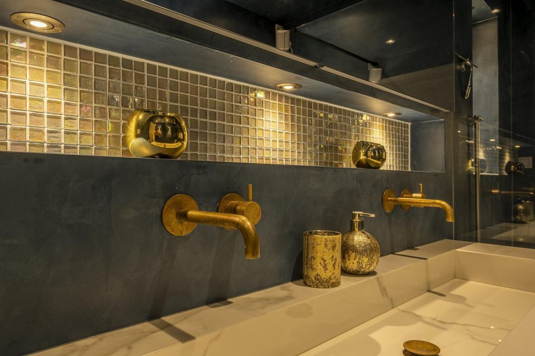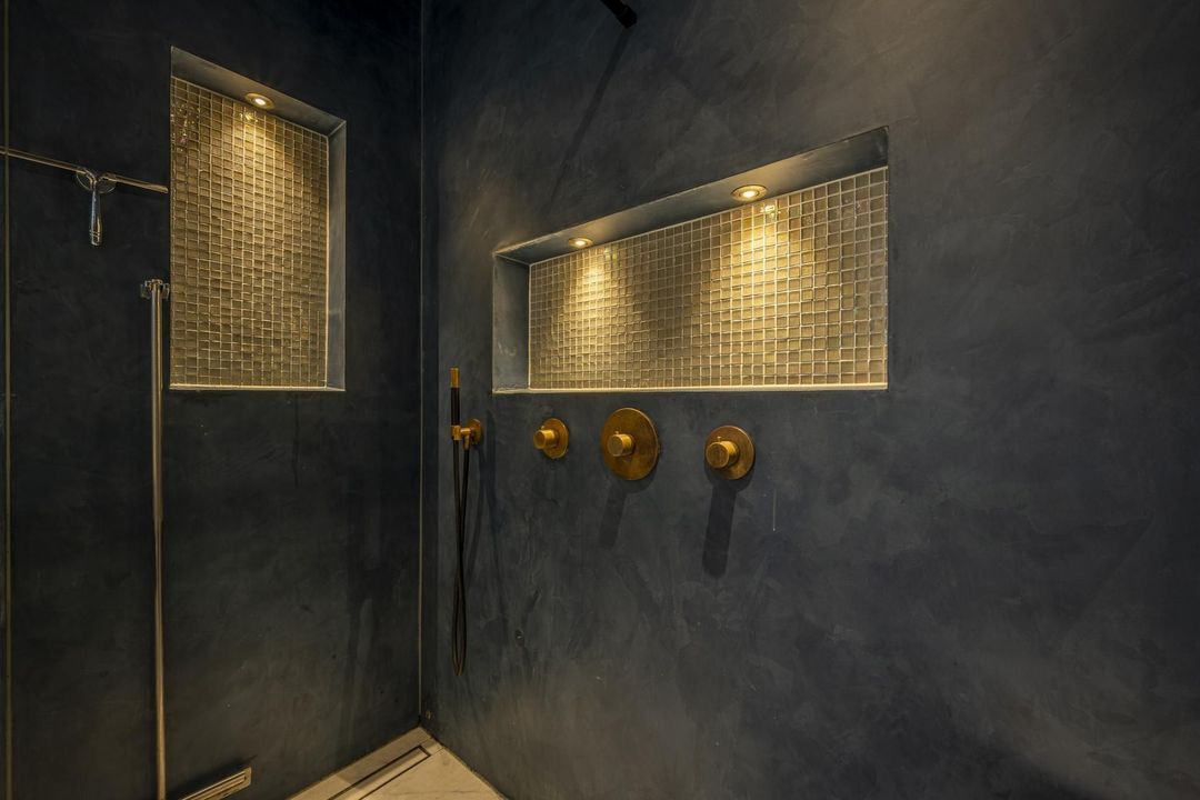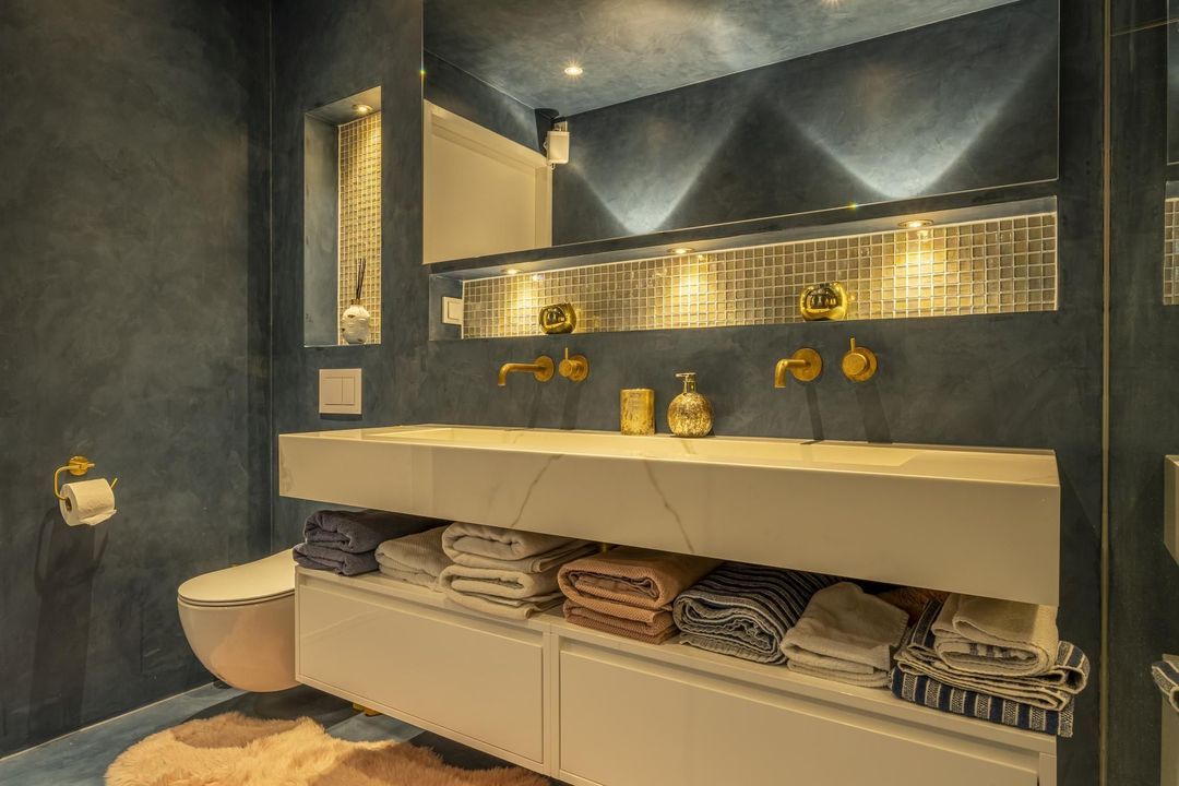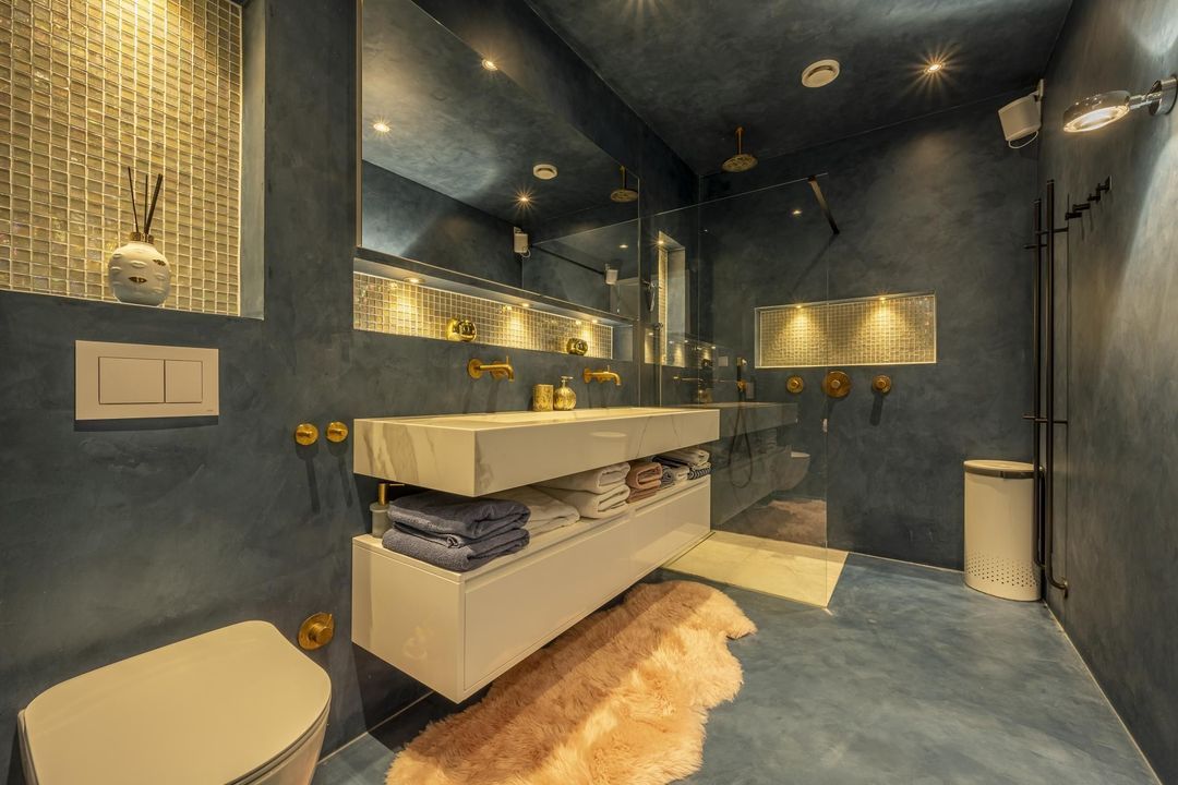 De moderne en stijlvolle badkamer uit 2018 is voorzien van een royale inloopdouche met ingefreesde stort- en handdouchekop, dubbel wastafelmeubel en toilet. De Beton Ciré afwerking en nisjes met mozaïek en spotjes in combinatie met koperen details zorgt voor een warme en luxueuze sfeer.