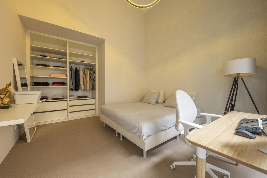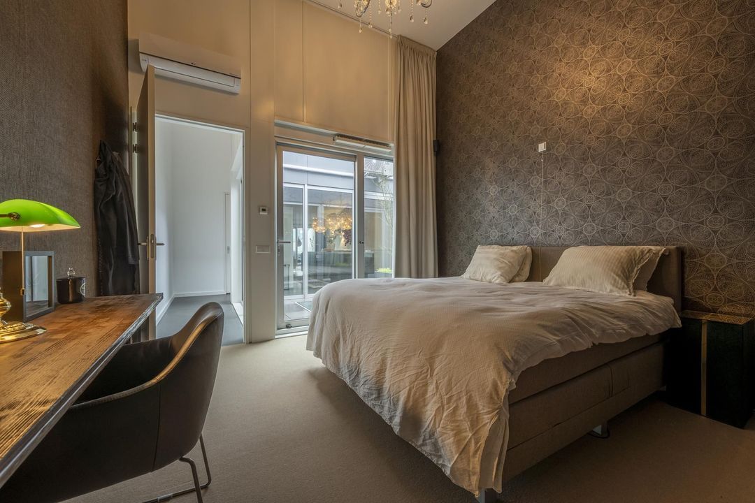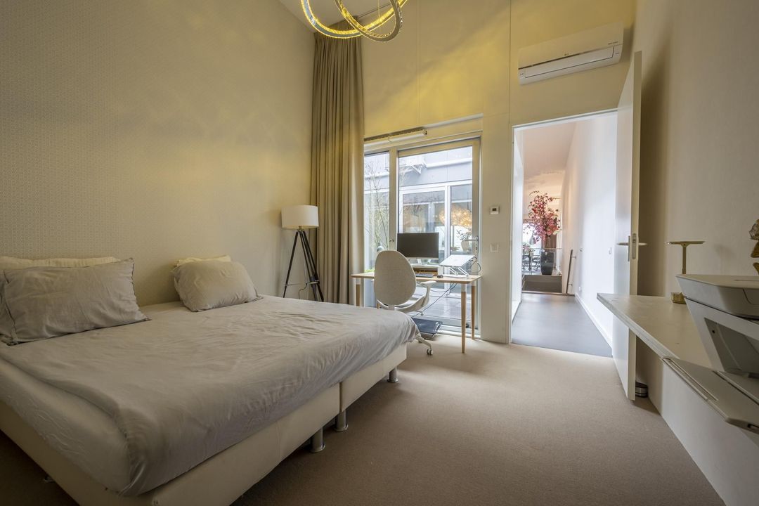 Het appartement bestaat uit twee ruime slaapkamers met airco, ideaal voor een goede nachtrust tijdens warme zomernachten. Ook de kamers hebben de unieke hoge plafonds en directe toegang tot de sfeervolle patio. Deze unieke buitenruimte zorgt voor een oase van rust en privacy in de woning en heeft via een raam uniek zicht van bovenaf de markthal in.